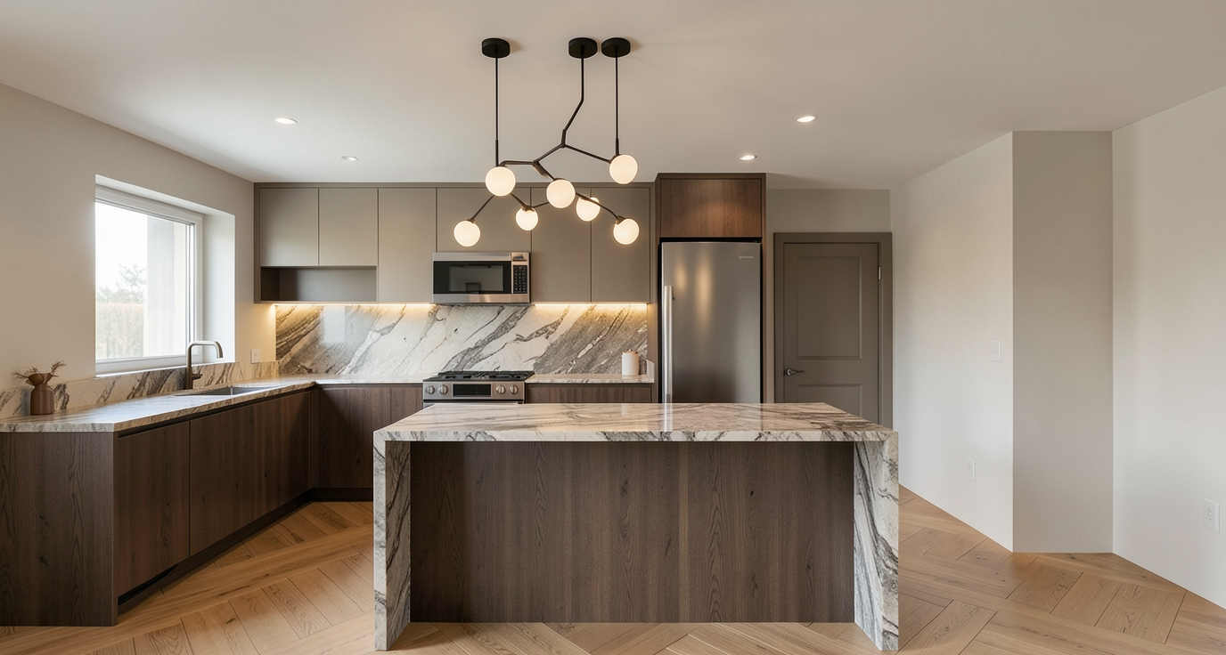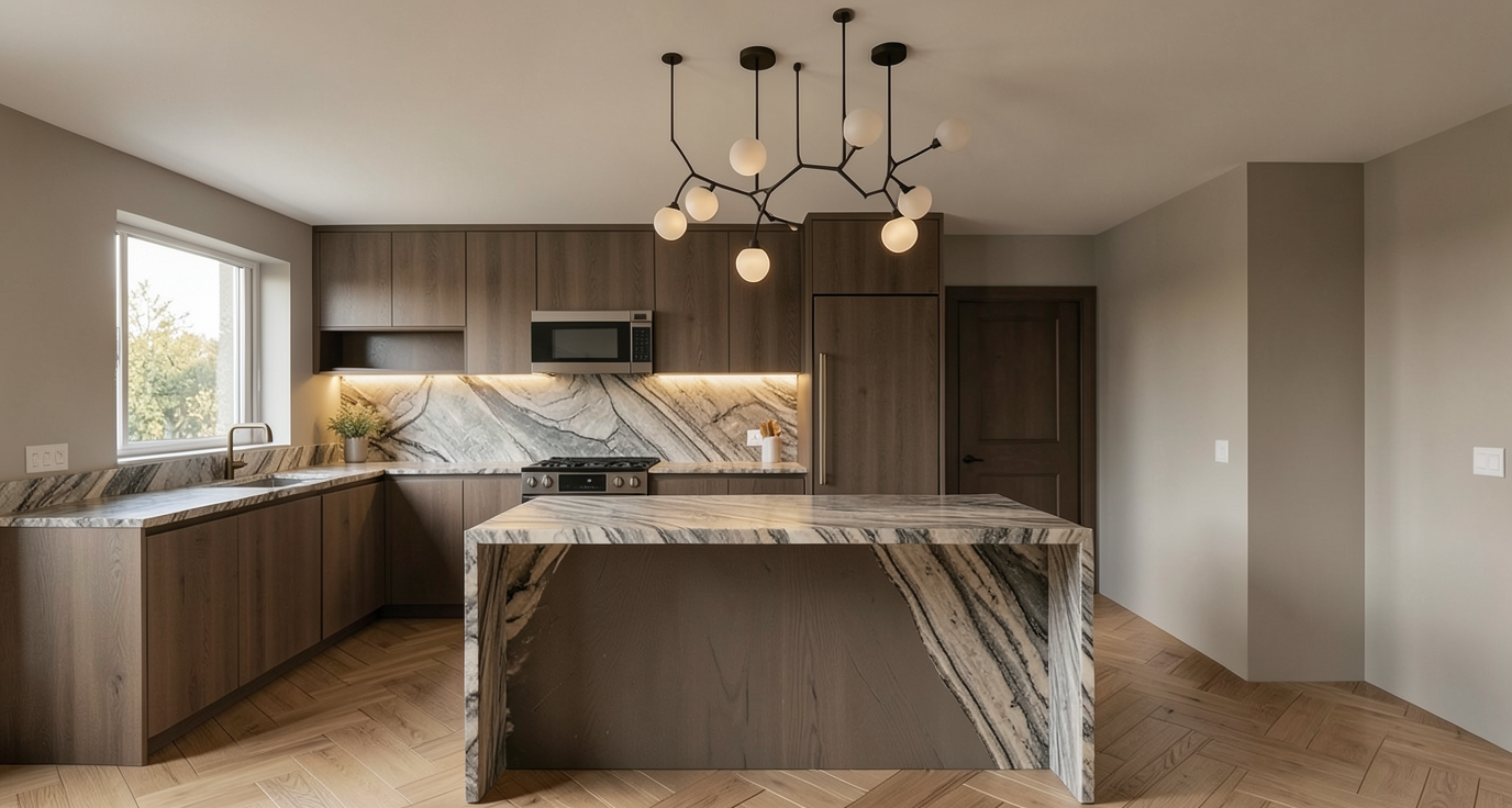 interior kitchen scene modern and minimalistic design warm and inviting atmosphere walls painted in a cool slate gray providing a sleek contrast to the white cabinetry light wood flooring adds a touch of warmth the countertop and island are a smooth matte charcoal stainless steel appliances for a polished look accent lighting under the cabinets creating a soft glow stools with light gray upholstery and light wood legs large window with ample natural light flooding in