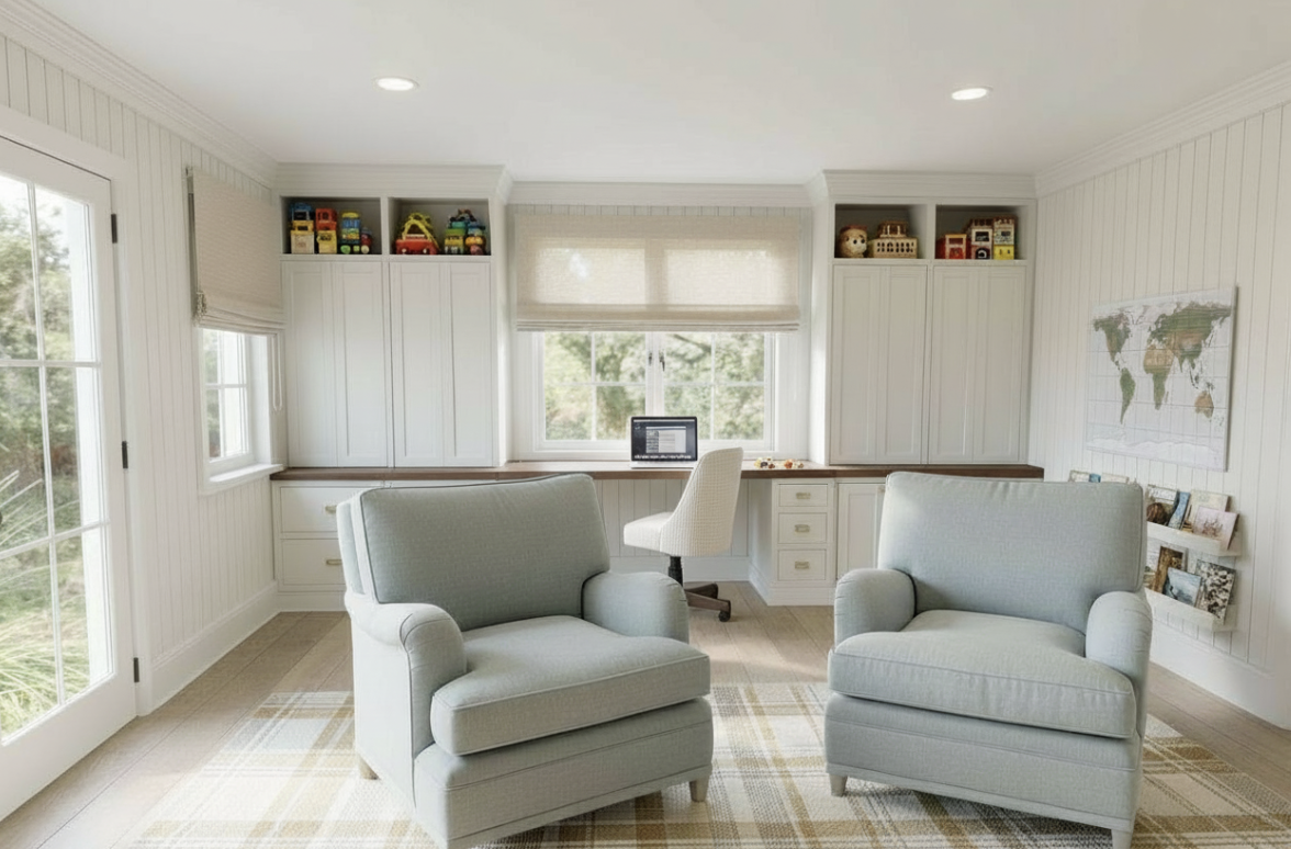 render this exactly as is but remove the chairs and replace the toys with accent decor