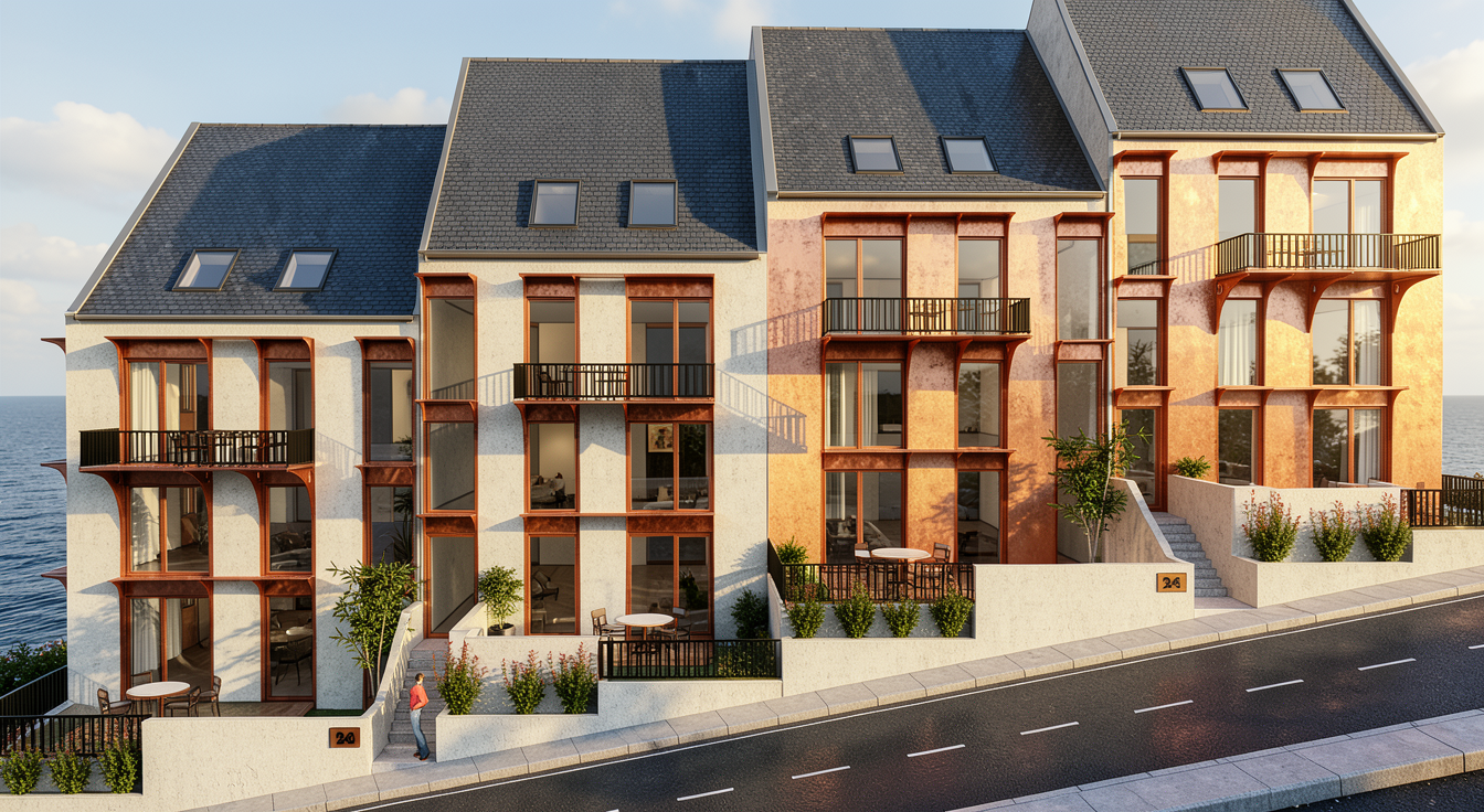make the yellow parts in a gold like material add one car on the road and add more vegetation in the gardens in front of the building