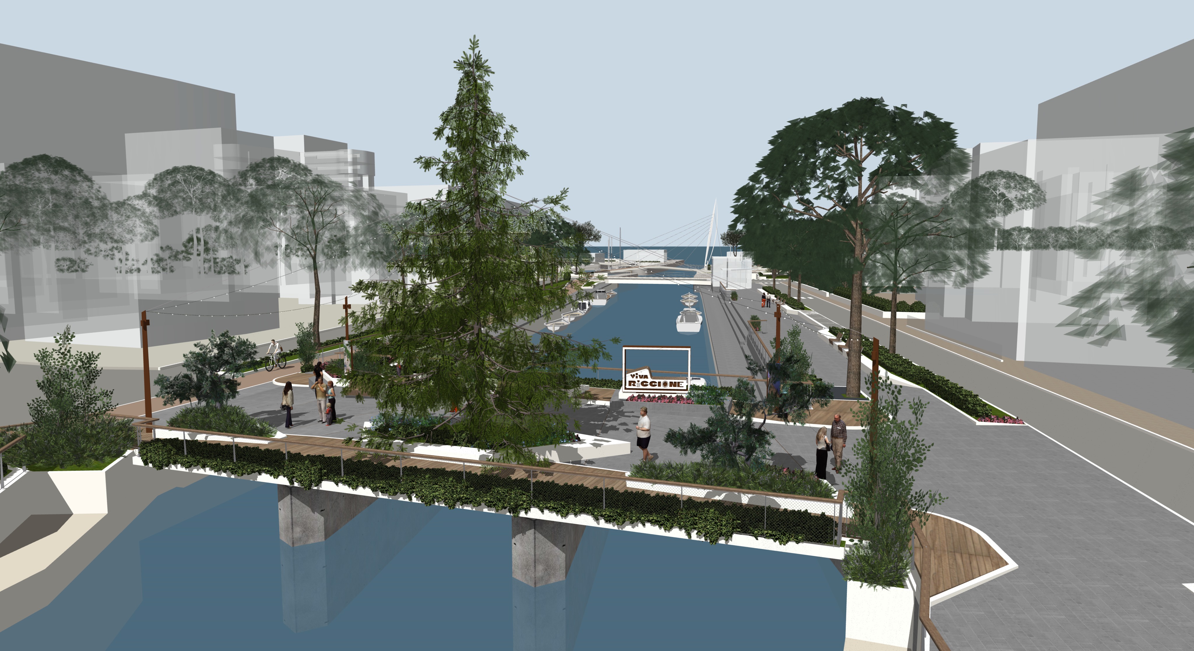 new street furniture on the river it s christmas eve and the tree is full of tiny lights everything is illuminated with atmospheric lights and many people cross the bridge gazing at the tree in admiration and talking to one another keep the buildings close together with light abstract volumes without doors windows frames or other details