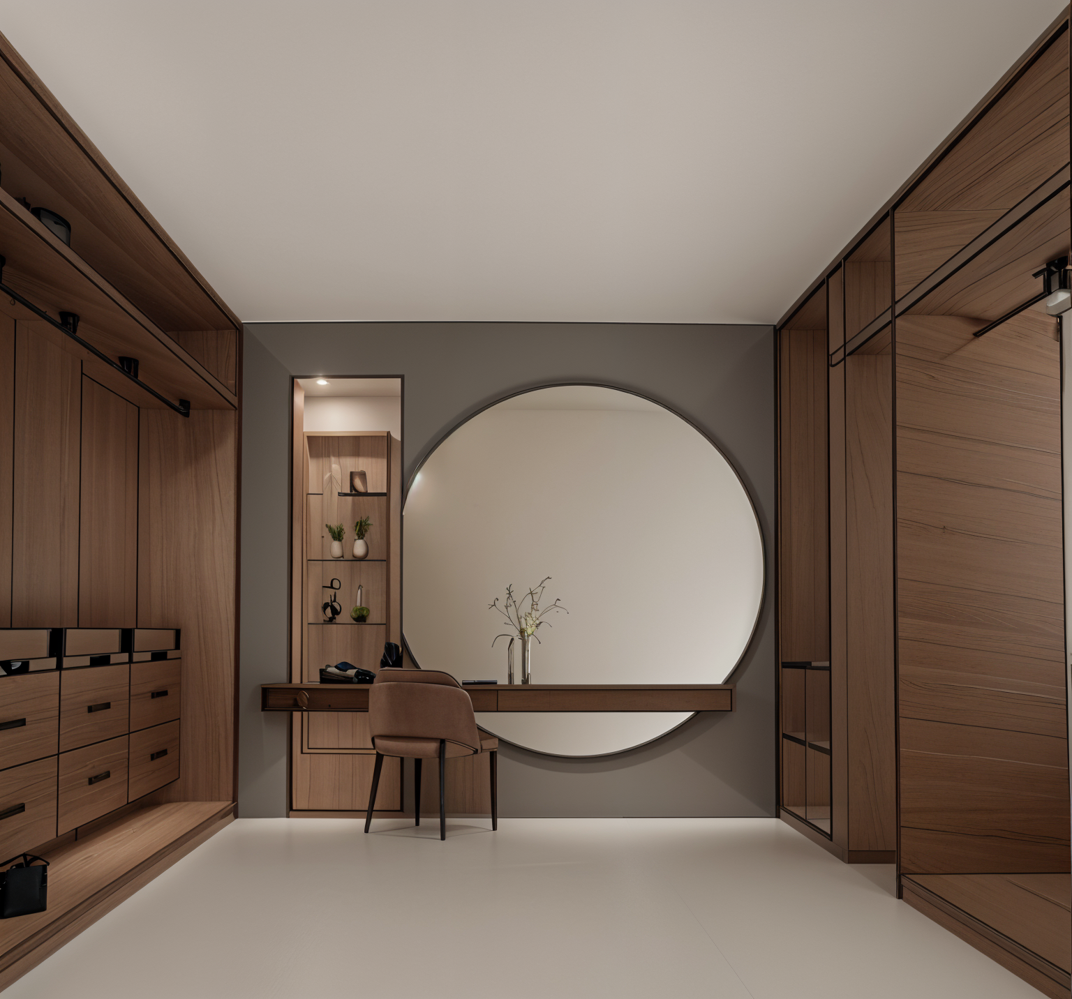 modernist interior shot walk in closet round mirror led lights realistic add clothes architecture