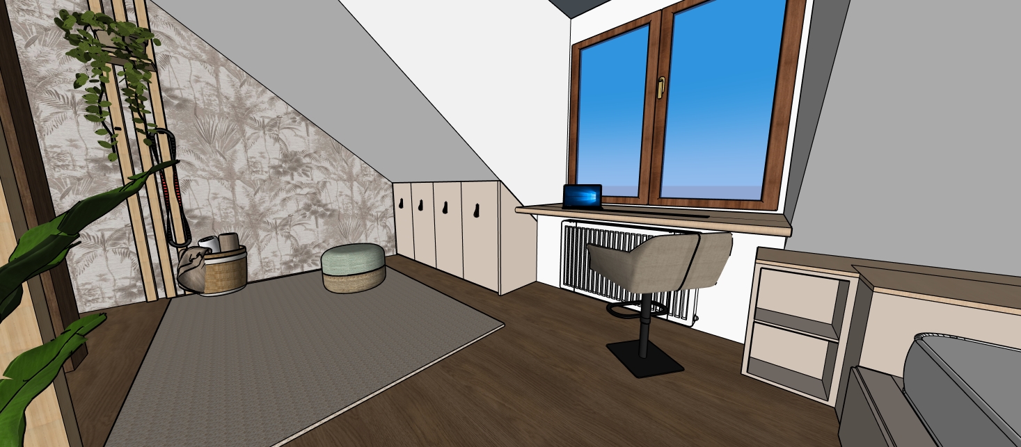 attic relaxation room in a family house multifunctional space for rest yoga and occasional sleeping sloped ceiling attic interior oak wood floor vertical wooden slats integrated shelves with indoor plants minimal furniture photoreal render wallpaper on back wall v hled z okna do korun listnat ch strom parapet vyu it jako pracovn st l 75 view from the window into the crowns of deciduous trees the window sill used as a desk