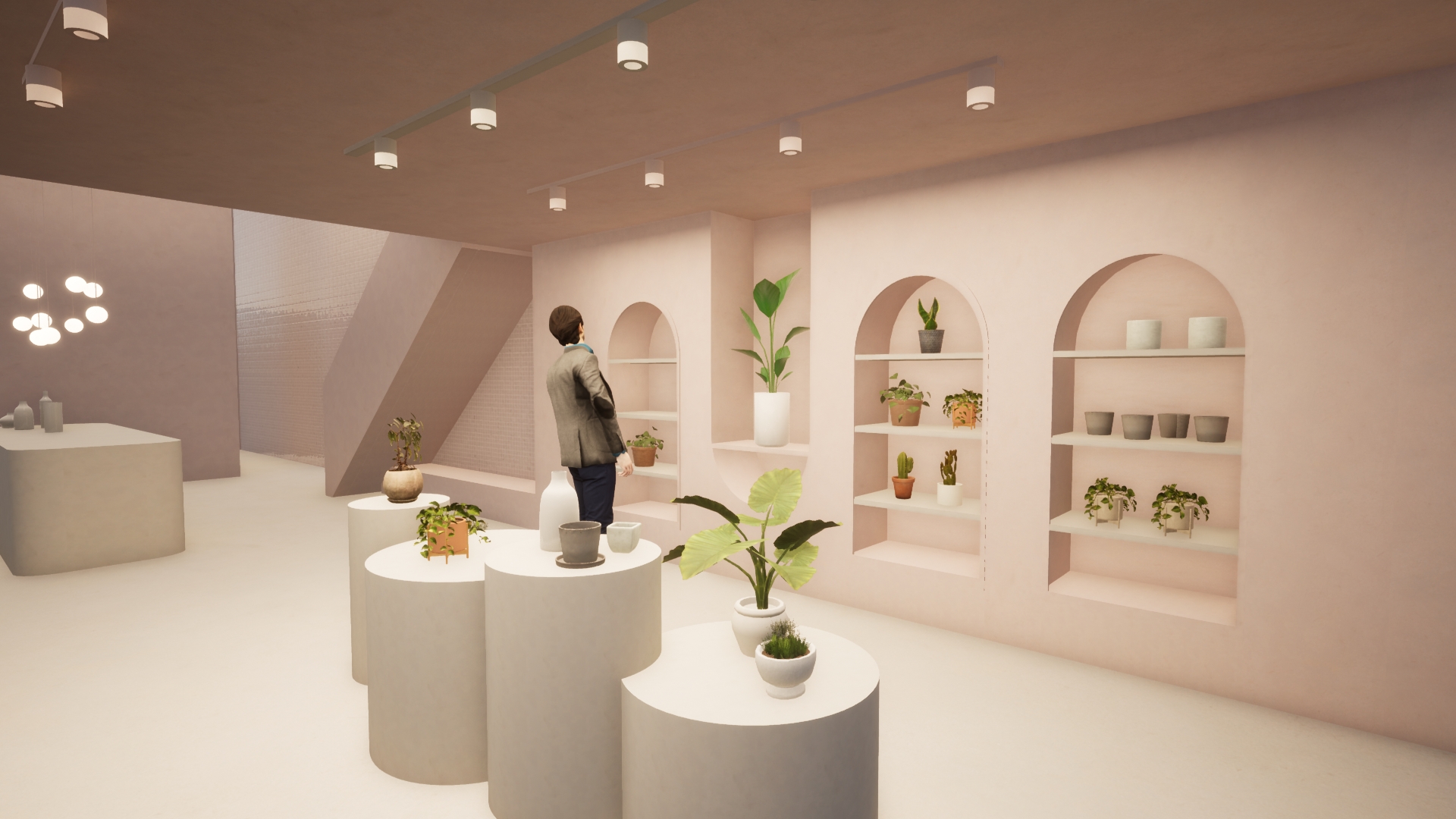 a warm lit flower shop with very warm toned moody lighting track lighting along the ceiling that is turned on all the walls and shelves are very light pink plaster the circular pedestals are solid oak wood the ceiling and floors are light concrete