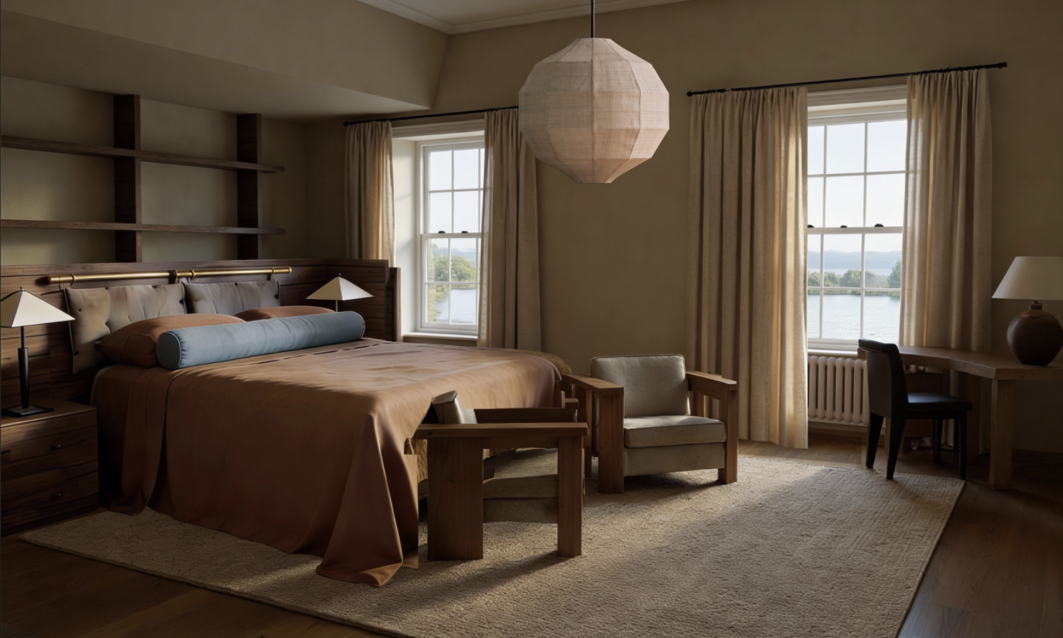 correct the cushions hanging from the rail on the headboard to an even warm woven dark neutral linen texture
