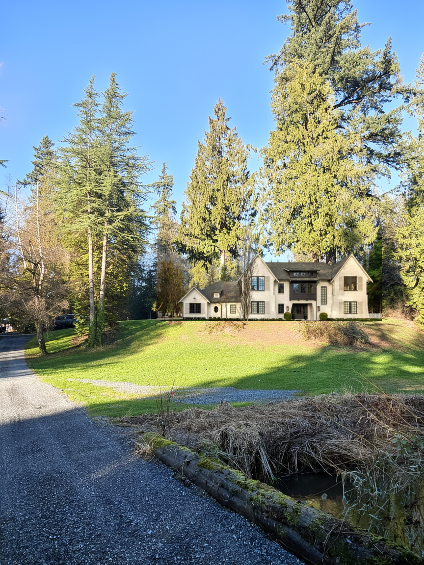 remove shadow on grass place house behind trees on the right