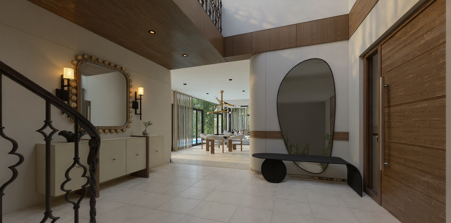 create a beautifully rendered modern living area use a soft warm color palette with ecru matte flooring the walls should be a sophisticated light grey and the cabinetry in ecru with wood accents incorporate black metal accents in the furniture and fixtures for a chic contrast ensure the atmosphere feels inviting and cozy with soft lighting to enhance the warm homely ambiance keep all original color of materials add subtle sunlight turn on lights add modern mediterranean front door panel at the left is a mirror add accessories on this foyer modern mediterranean theme add accent wall flooring is in black and white matte tiles add back wall panels and european indoor plants flooring in checkered diagonal black and white matte tiles for the foyer