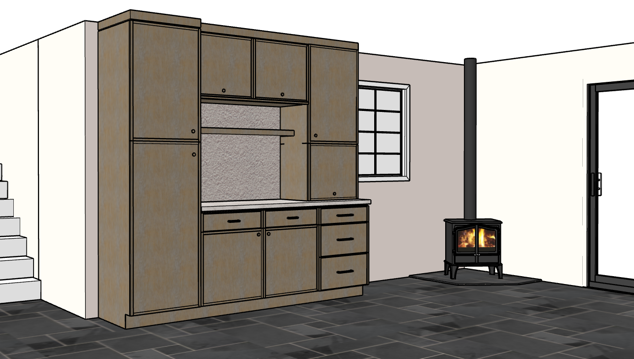 render this kitchen with realistic lighting and recessed ceiling lights to brighten the space keeping the wood tone in the model