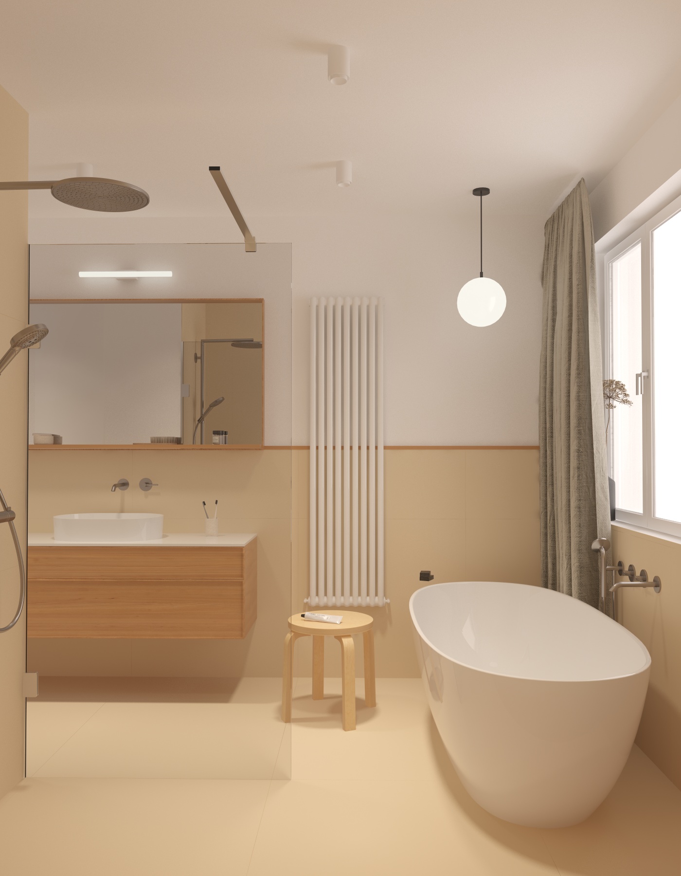 do not modify the geometry in any way keep all proportions dimensions and architectural elements exactly as provided enhance the render to make it more realistic by improving lighting quality reflections shadows and overall visual depth improve global illumination and light balance but do not change the color tone texture or finish of any materials do not alter material colors or textures keep them exactly as they are only refine the lighting and rendering quality to achieve a more photorealistic result the tiles are matt