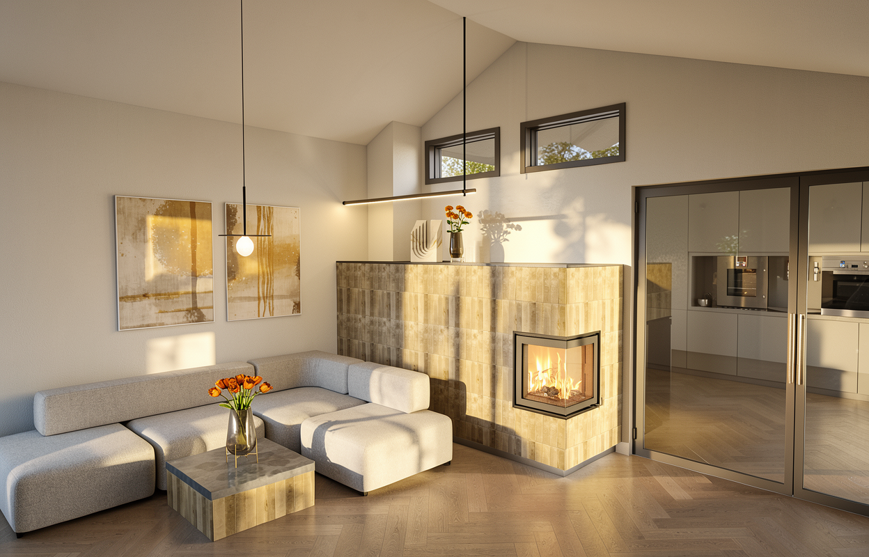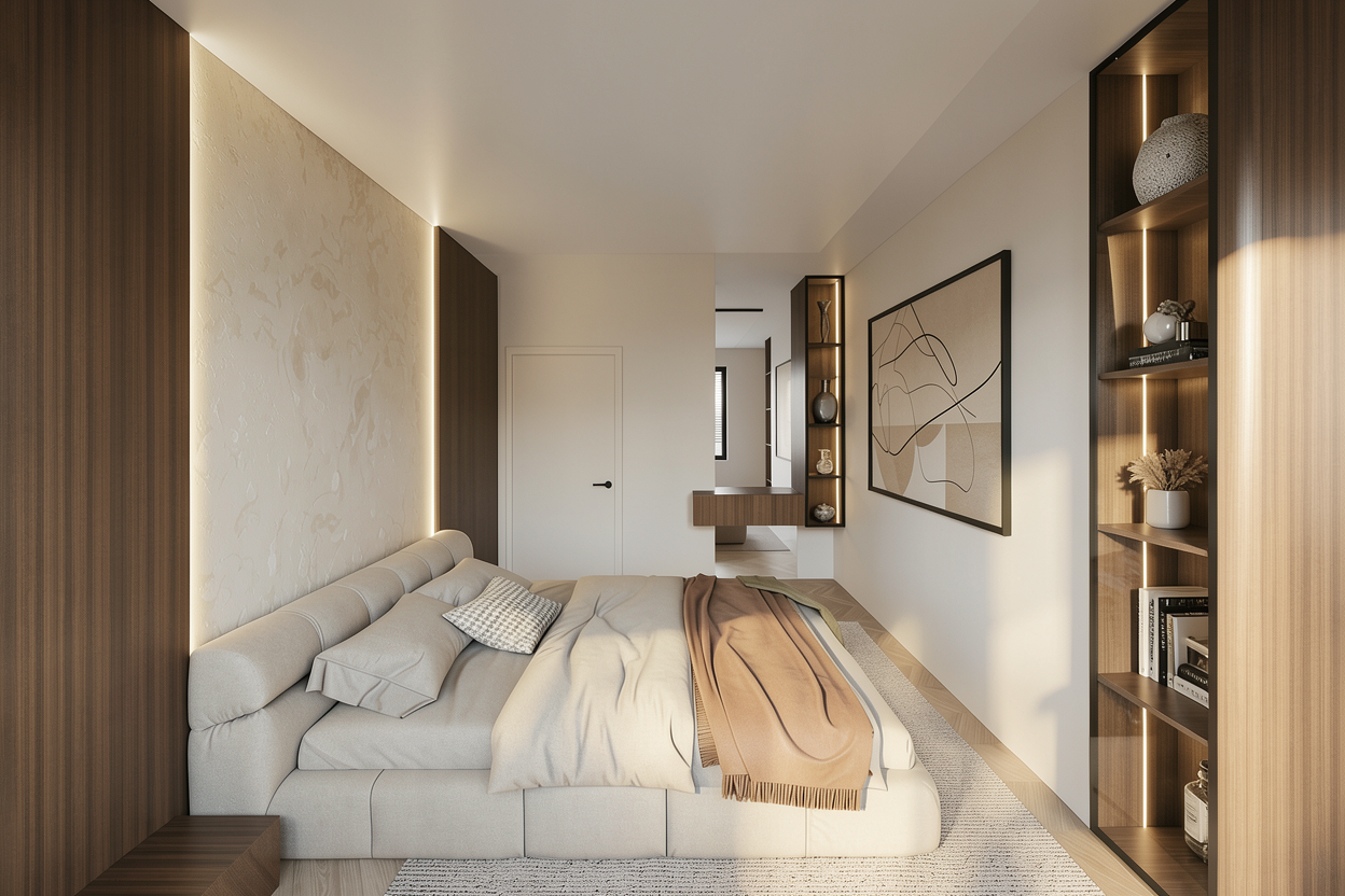 a modern minimalist kitchen interior design in a warm inviting atmosphere use soft beige and taupe for the cabinets and walls complementing with a clean crisp white for the countertops inoc frigde and oven and microwave incorporate a sleek matte black for the faucet and light fixtures the dining chairs are upholstered in light beige for a cozy touch paired with a glass top table supported by black steel legs the floors have a polished gray finish natural light floods through the window casting soft warm shadows creating a serene and elegant environment