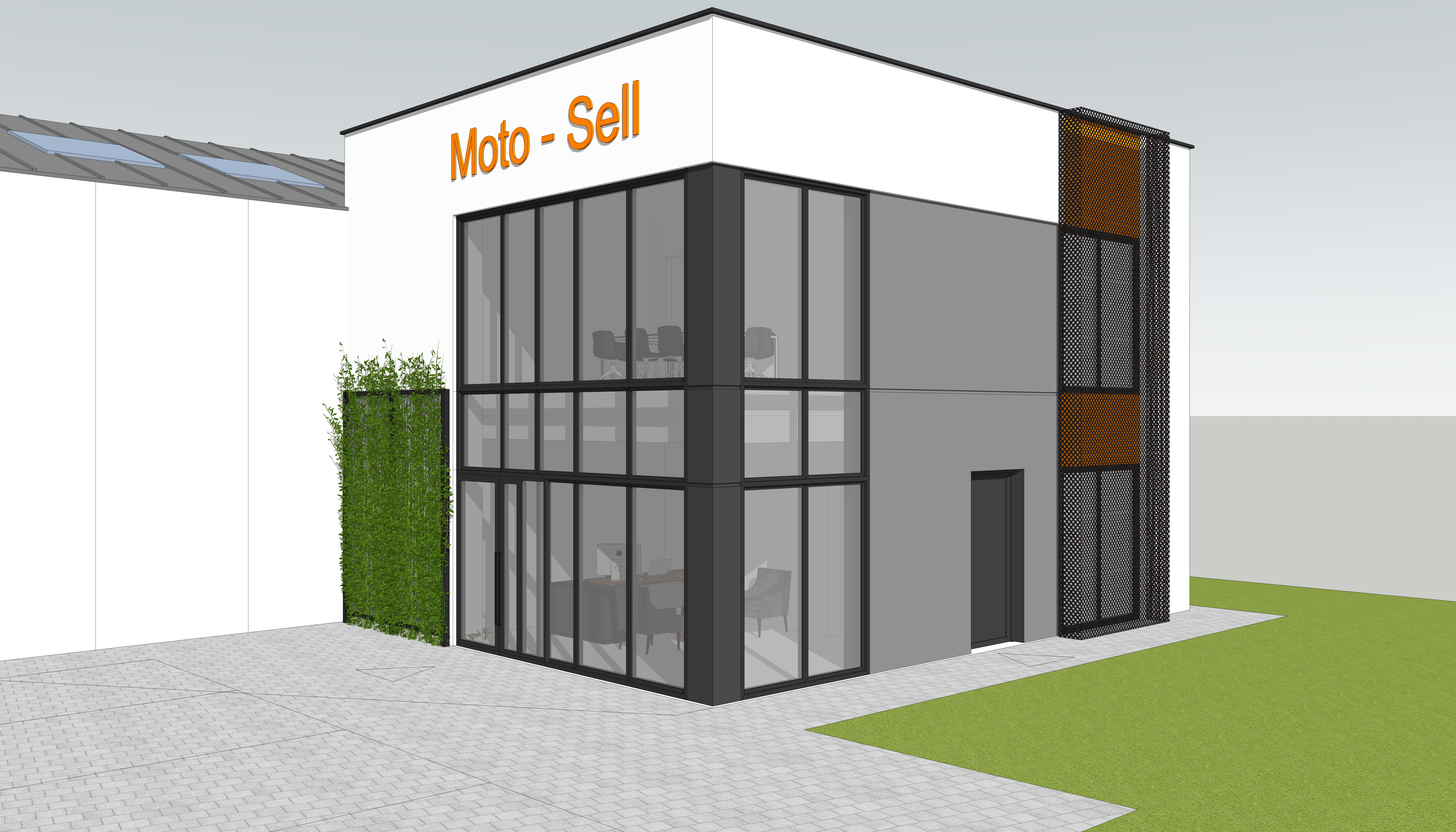 modernist exterior shot modern commercial building exterior sleek glass facade with black frames vibrant orange signage reading moto sell lush green ivy climbing the white walls elegant gray concrete surface bright green lawn soft natural daylight atmosphere minimalist urban style architecture