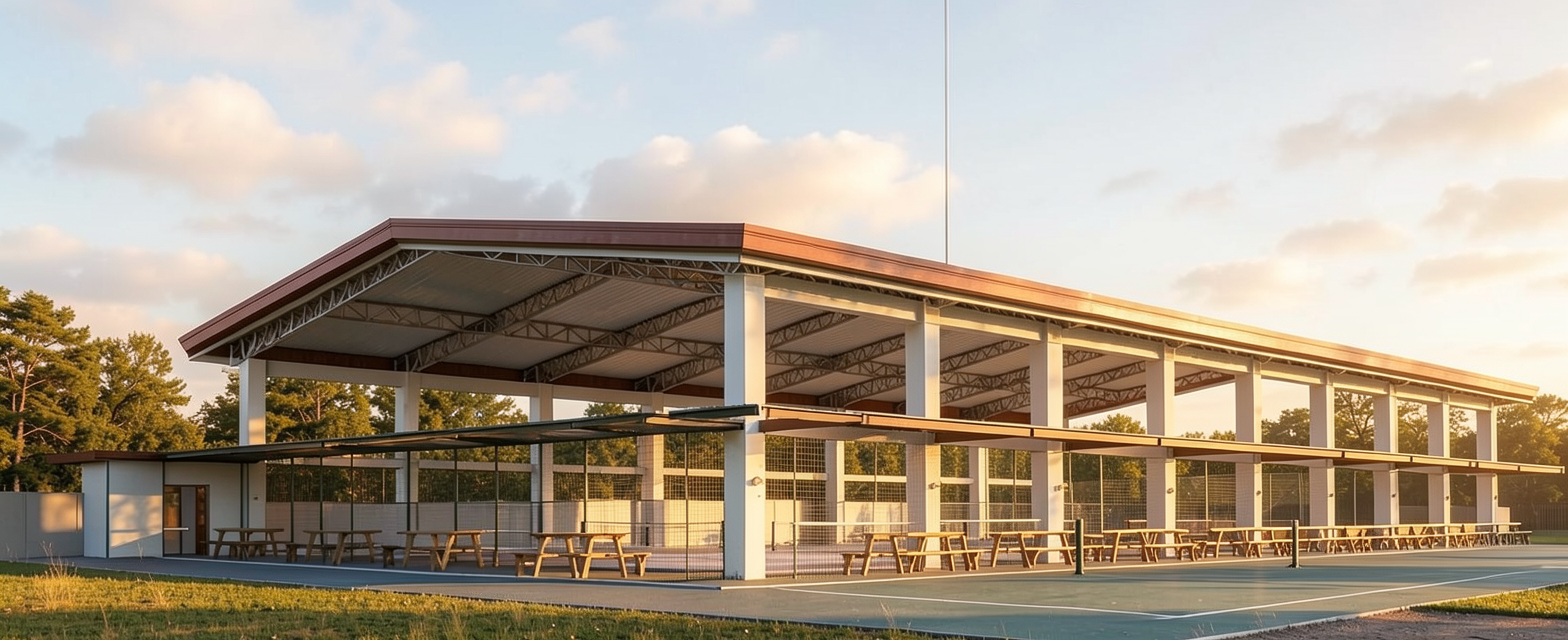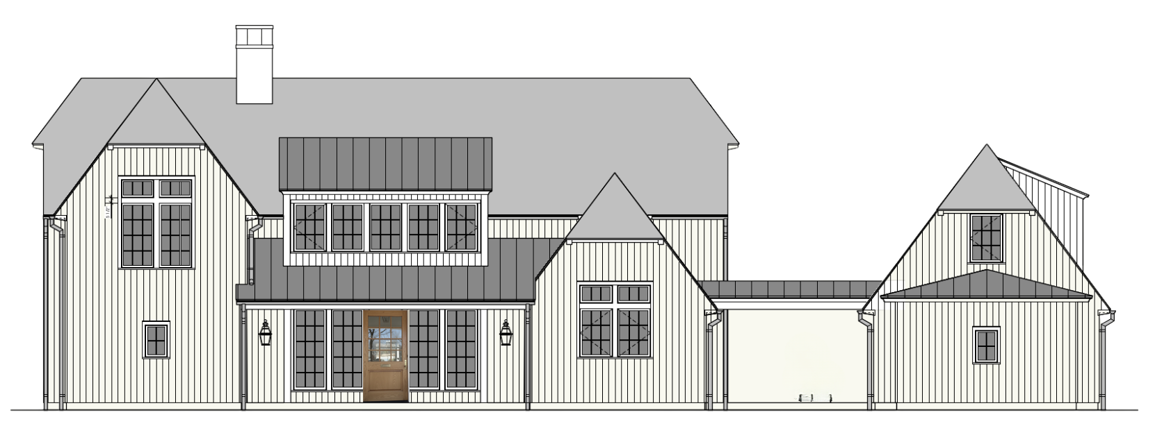 exterior of home with white painted vertical siding grey metal lower roof grey asphalt shingle upper roof white oak front door light blue painted windows copper sconces stone chimeny set in a rural landscape with soft daylight lighting