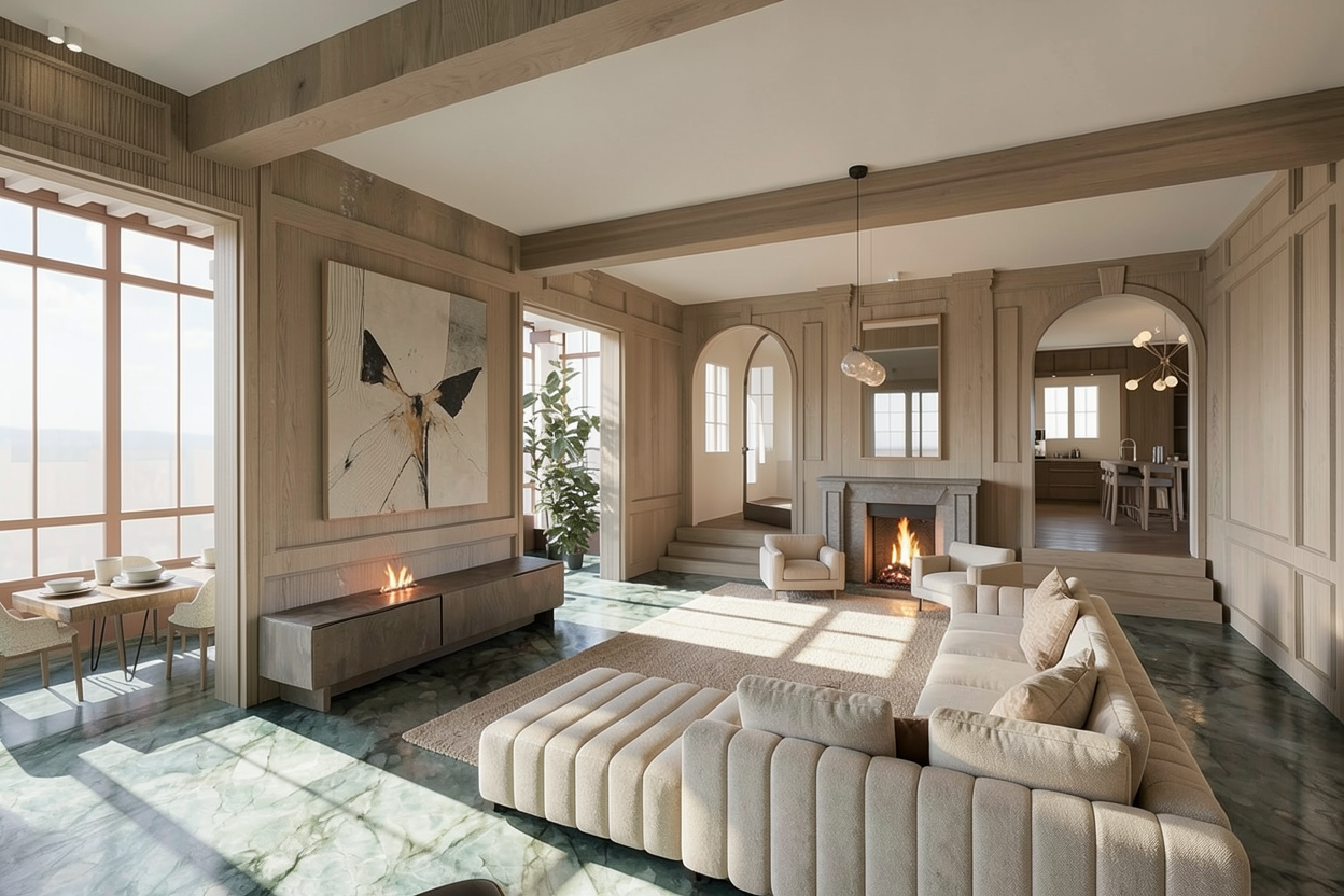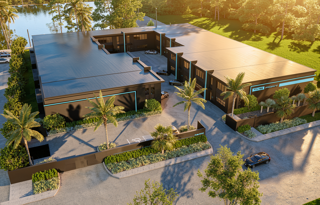 create a hyper realistic exterior photograph of a coastal house front exterior during a vibrant sunny day the house has a sleek tropical modern design with crisp white walls and white wood brackets the roof has gray cement tile large glass windows reflect the clear blue sky the garage door is white wood with some small glass openings palm trees with their lush green fronds add a tropical touch the house has surrounding green lawn the atmosphere is tranquil and luxurious with sunlight casting gentle shadows evoking a sense of relaxation and opulence