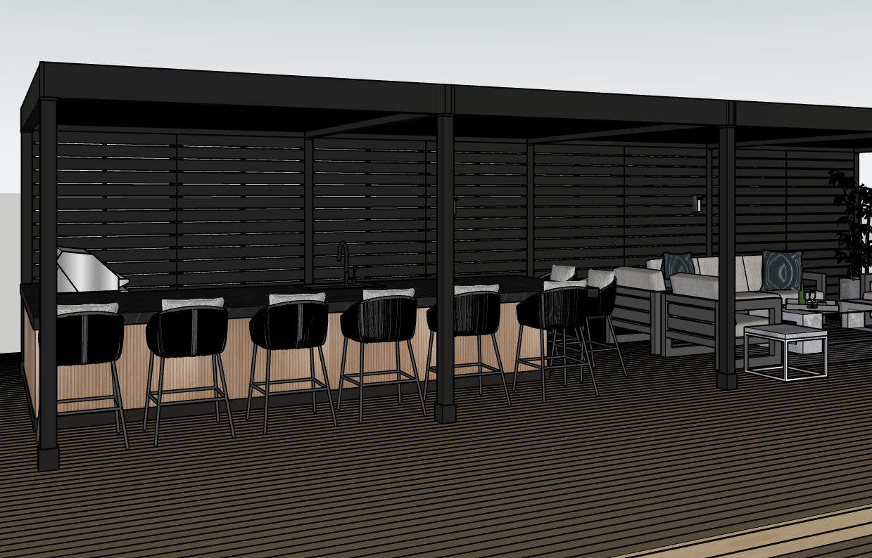 ultra realistic modern outdoor entertaining area featuring a matte black pergola with clean architectural lines and black trim black marble countertop with subtle natural veining and soft polished reflection front of the bar clad in wood look matte fluted porcelain tile with vertical ribbed texture and realistic material depth dark grey woven counter stools with grey patterned fabric cushions detailed fabric texture and stitching subtle wall sconces casting gentle shadows across a horizontal slatted privacy wall creating soft architectural light without led strips timber deck boards with natural grain variation and realistic spacing bright natural daylight soft diffused lighting realistic hdri sky landscaped backyard setting with subtle greenery depth matte black powder coated steel with soft reflections realistic shadow softness global illumination ambient occlusion physically based rendering architectural photography eye level perspective 35mm lens shallow depth of field slightly blurred background balanced exposure true to life colours photorealistic high detail 8k resolution keep original layout and proportions do not redesign structure no led strip lighting no dramatic sunset lighting no neon glow