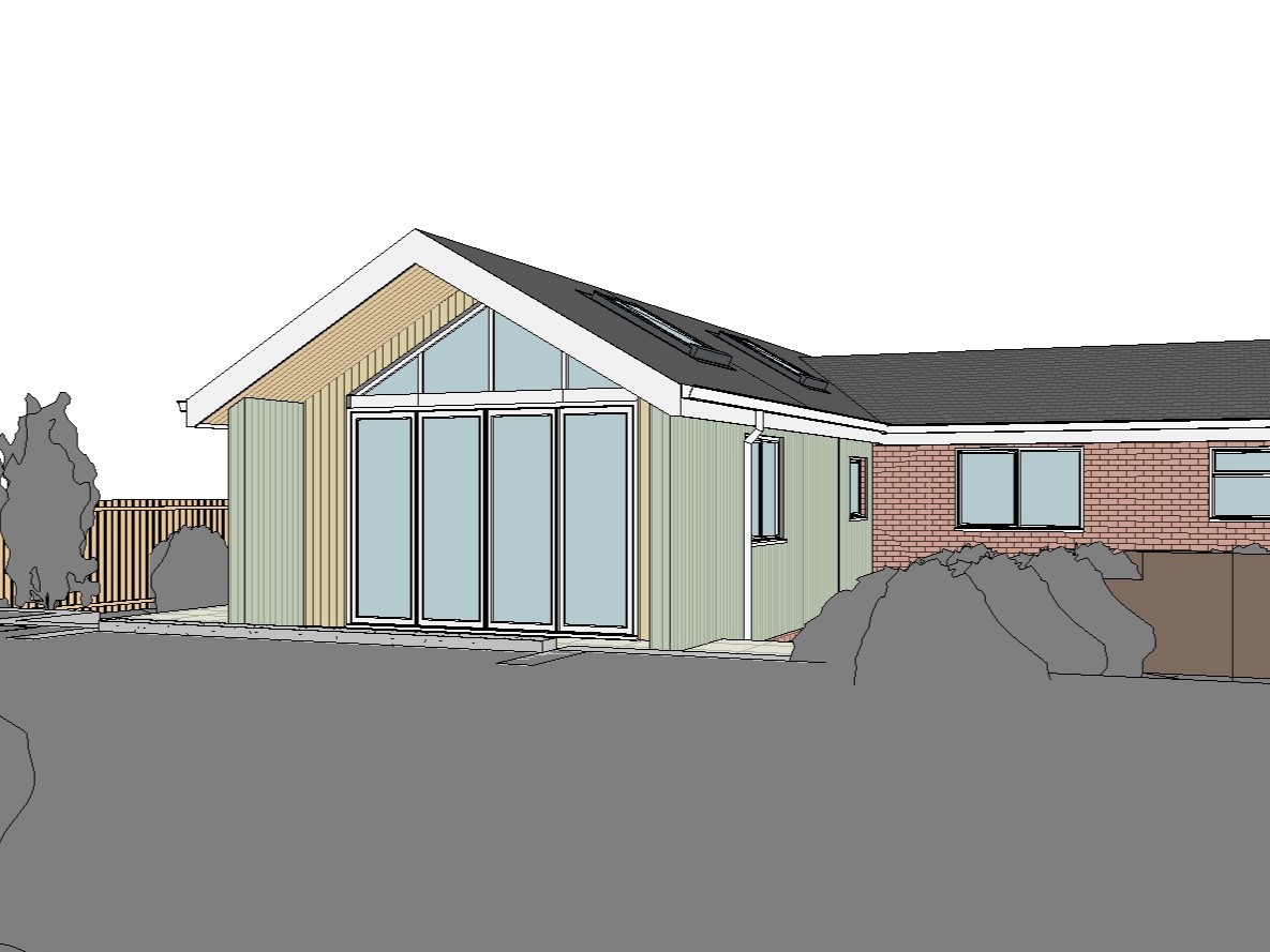 create a realistic external render of a uk home from the provided sketch screenshot keep the same shape proportions and materials use dark red wall bricks realistic roof windows and doors show bright natural daylight with clear sky and soft shadows add subtle landscaping natural reflections and clean true to life lighting