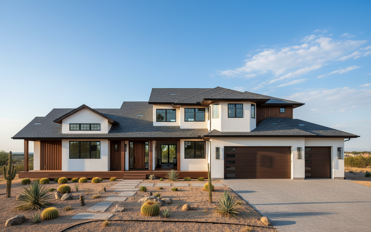 modern barndinium front elevation with 45 degree angle to a triple garage single door on left of double door upper floor comes forward over garage roof slate gray walls white with dark wood trim windows large with black frames deck wrap around door dark oak garage matching walls landscape xeroscape sky clear blue with soft morning sunlight overall atmosphere inviting cozy harmonious blend of modern architecture and nature
