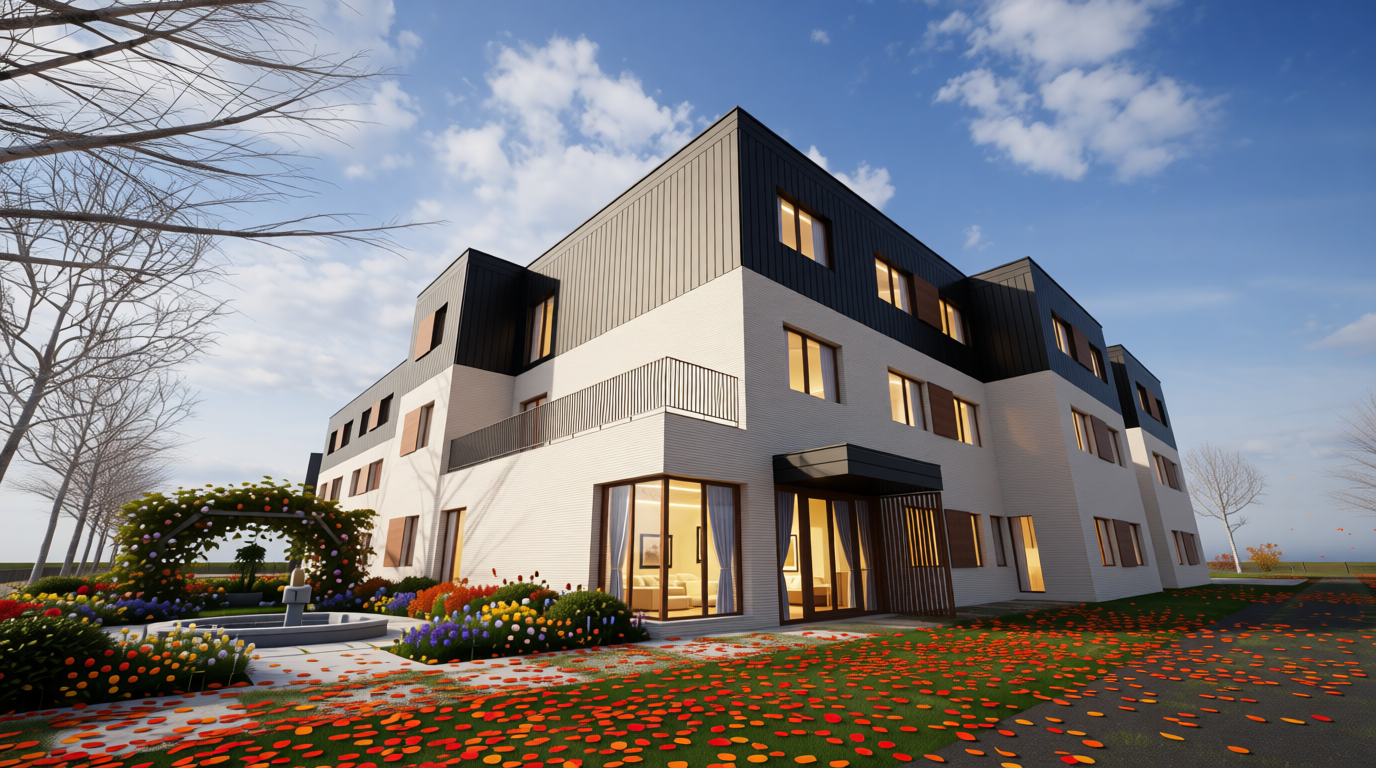 light up facade and garden put garden to right back keep geometry put people silhoutettes to garden summer midday