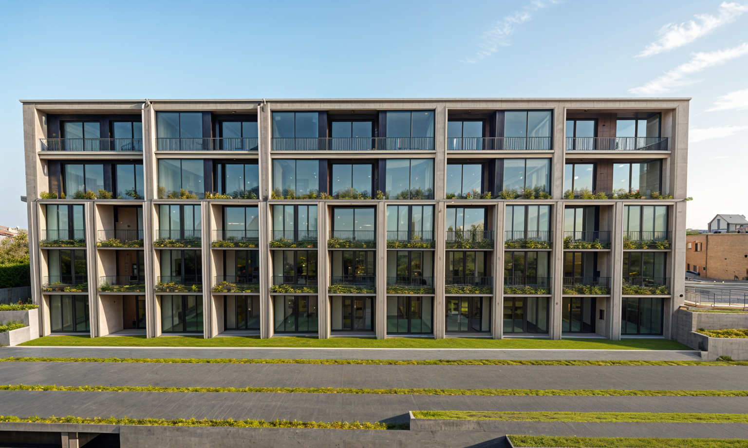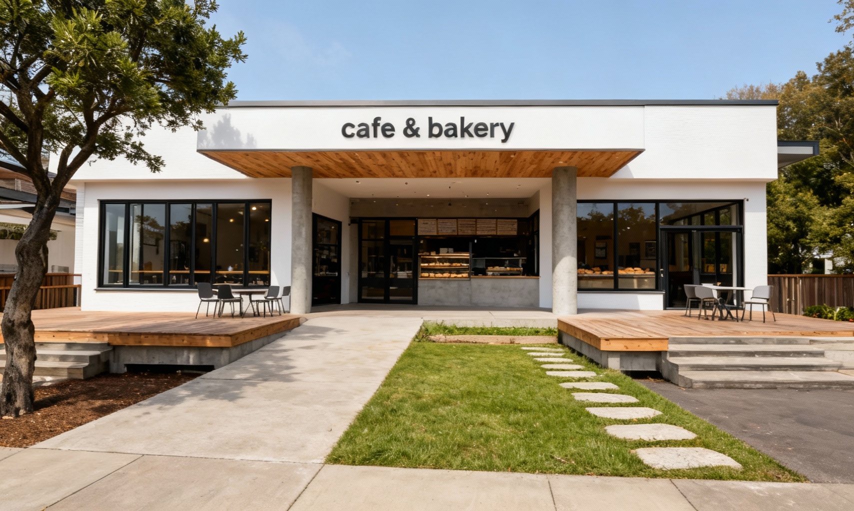 modern style industrial black frame canopy concrete keep the canopy column wall finishing white color and plywood remove the arch the window is a fixed window frame the front garden has grass and stepping stones roof removed