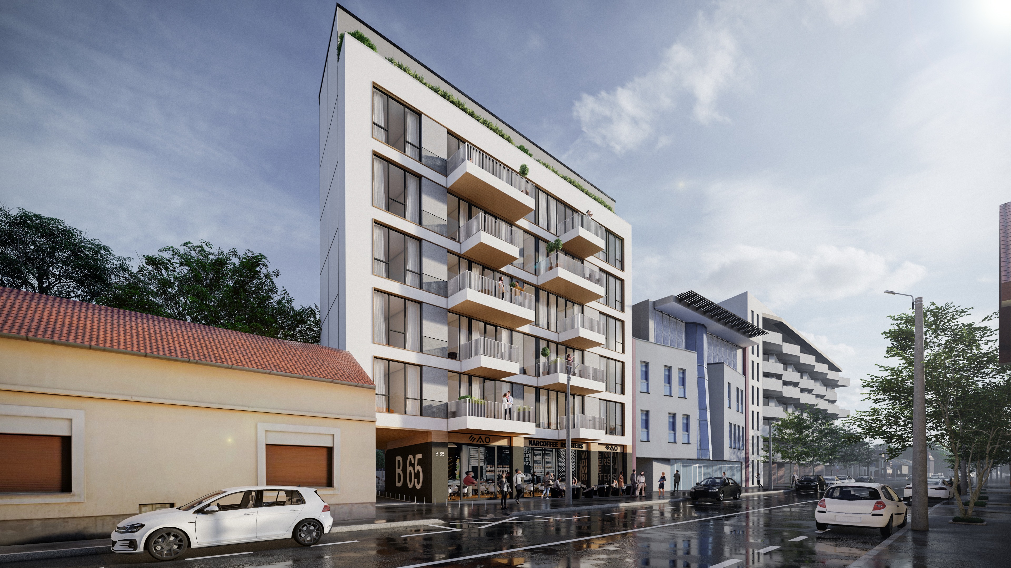 important preserve the existing geometry and the existing context exactly as provided do not modify alter reinterpret add remove scale or reshape any geometry do not change the site surroundings street layout neighboring buildings vegetation or context elements do not modify geometry scale proportions buildings road layout sidewalks or surrounding context in any way do not change text photorealistic architectural rendering clean and balanced contrast calm cinematic mood style contemporary european residential architecture minimalist premium understated include people and cars subtle motion blur for realism soft overcast sky noon atmosphere diffused neutral natural daylight with subtle grey tones cinematic architectural mood warm interior lighting 3000k glowing from inside creating strong contrast between cool exterior and warm interior large glass surfaces with realistic reflections soft mirror effect environmental reflections of sky and surroundings important do not add new windows add people with motion blur inside the building