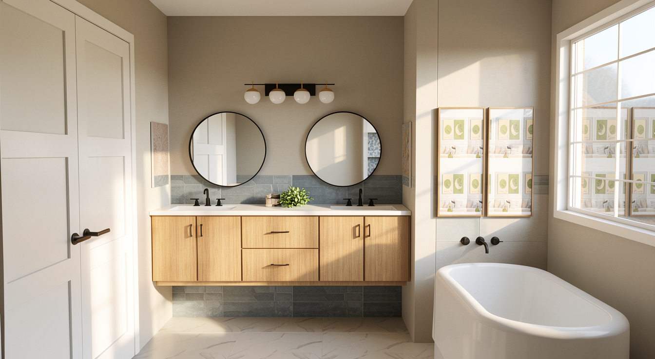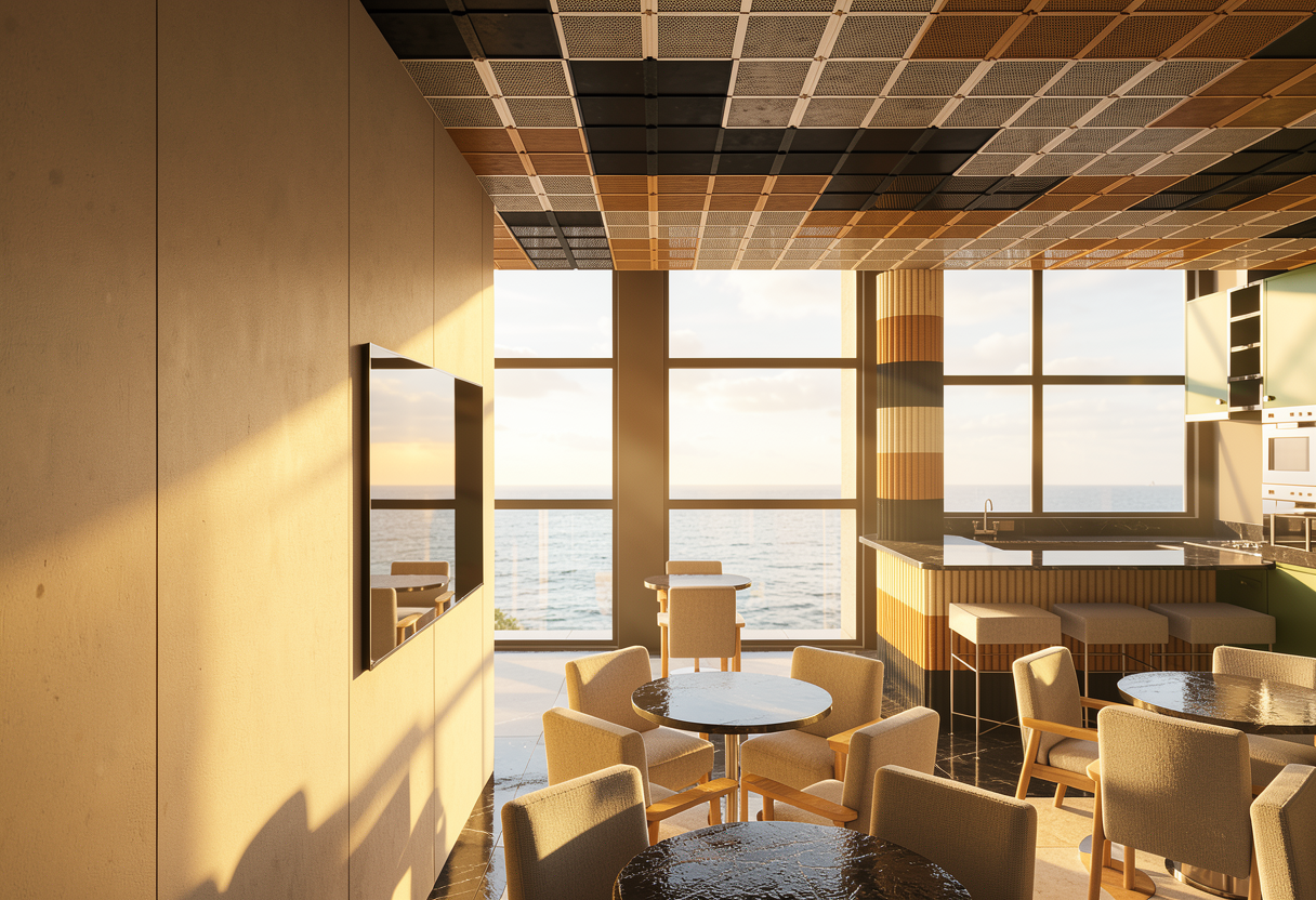 the island is rift white oak the painted cabinets are painted a dark red color the back is a recessed niche into the wall with clear glass shelves there is a brushed brass foot rail along the back side of the island the countertop is a reeded section of countertop sandwiched in between two 2 cm tops