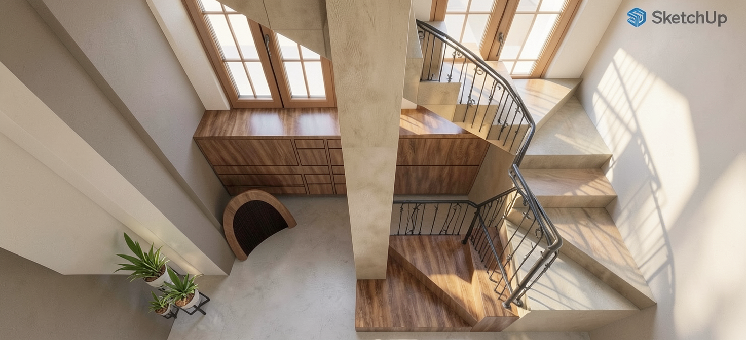 transform this architectural view into a high end photorealistic interior render preserve 100 original geometry volumes proportions alignments perspective and camera position do not redesign reinterpret or modify architectural elements maintain sharp edges and original structure natural soft daylight entering from window side interior lighting calibrated like professional architectural photography neutral warm white balance 4600 4800k balanced exposure soft highlight roll off realistic global illumination soft contact shadows natural dynamic range no dramatic or cinematic mood material system floor dark oak hungarian herringbone parquet matte finish visible wood grain subtle plank variation low reflectivity realistic depth dark wall and fireplace base lead grey plaster matte slightly textured deep tone uniform surface clearly darker than upper volume light walls and ceiling fine white plaster soft matte diffuse light behavior fireplace upper suspended volume textured taupe plaster warm grey tone matte finish subtle material variation fireplace frame and internal vertical element black matte iron dark metallic surface subtle micro reflection non glossy fireplace glass transparent with realistic refraction and soft reflections wood log storage realistic stacked firewood varied diameters irregular cuts visible bark texture natural cracks color variation from beige to warm brown visible end grain depth between logs strong contact shadows no repetitive pattern shelf styling minimal contemporary decor 3 4 neutral hardcover books small matte ceramic vase minimal wooden box balanced spacing no clutter realism enhancement physically accurate materials micro surface imperfections slight roughness variation on plaster subtle edge softening on sharp corners natural light falloff on walls reduce digital uniformity no color shift no material blending no surface merging photographic architectural realism similar to corona renderer daylight interior clean soft natural elegant atmosphere