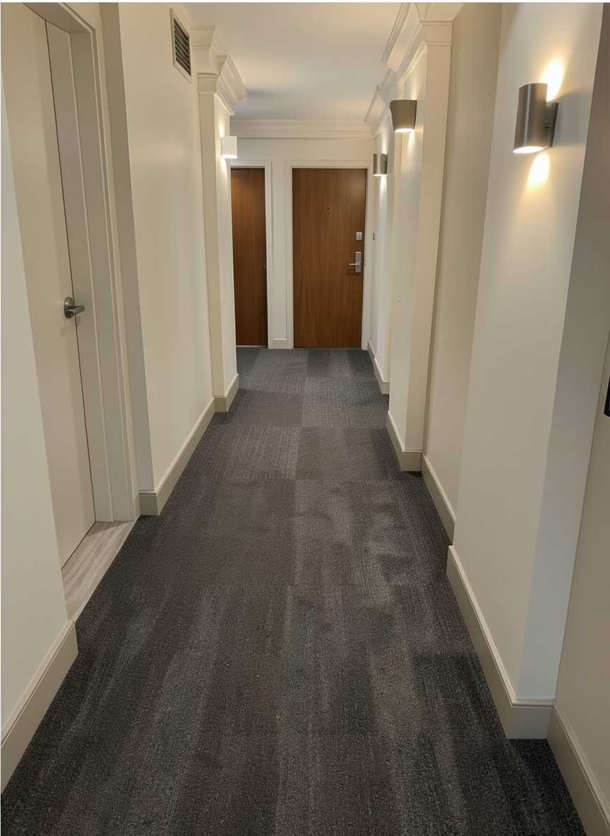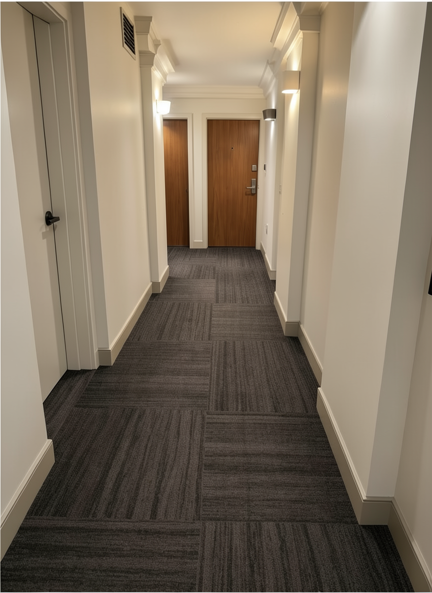 enhance the lighting by replacing the existing wall sconces with simple modern neutral toned fixtures in the exact same locations fixtures should be minimal with a clean contemporary design in a soft white brushed nickel or matte finish lighting should be warm and even replace the existing flooring with a high end luxury vinyl tile lvt suitable for a residential condo corridor the flooring should be in a warm greige to deeper taupe tone for added richness feature a subtle stone or travertine inspired texture include gentle tonal variation to add depth without visible pattern repetition be fully matte with no sheen or reflectivity read as refined and upscale not flat or overly uniform the overall effect should feel warm sophisticated and slightly more expressive while remaining calm and appropriate for a residential setting do not change any finishes materials colours doors trim or architectural elements only update the light fixtures and flooring