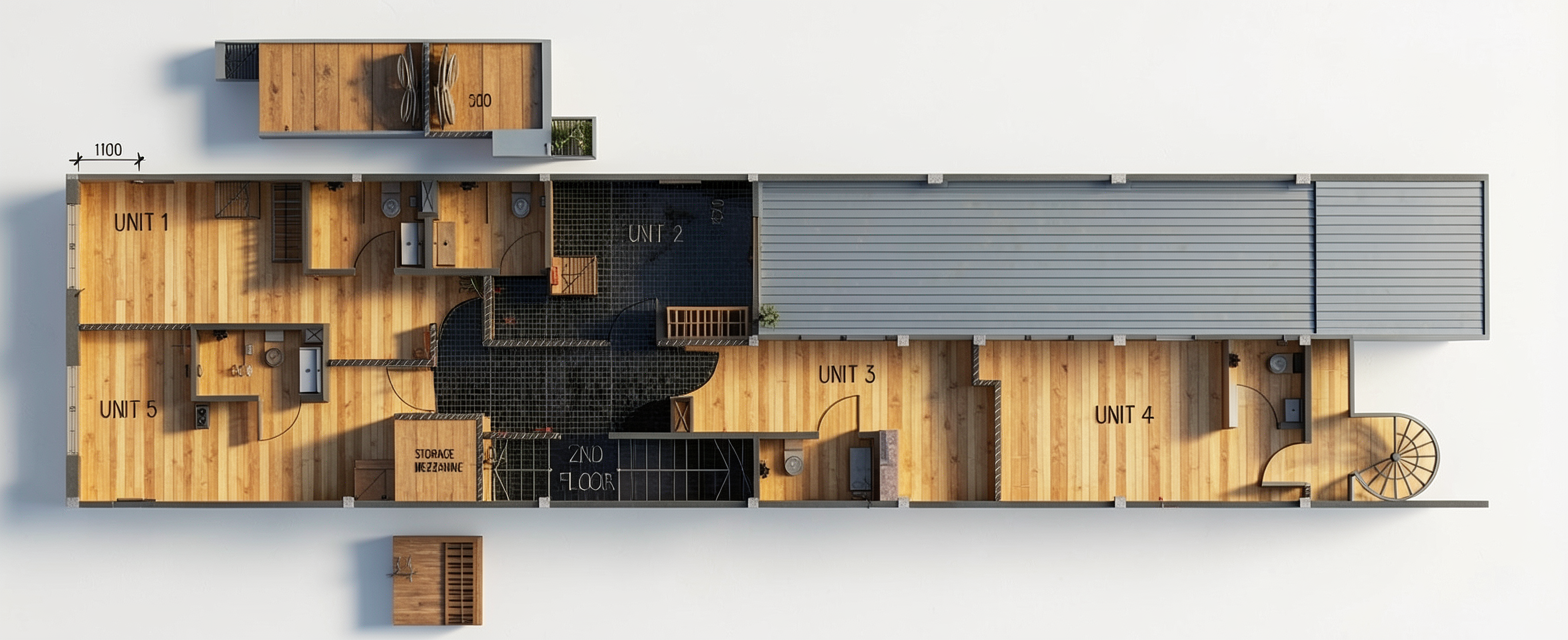 location is pacific palisades afternoon view add drought tolerant landscape and grasses around the house keep the perspective view angle from the source image add a woman walking in the corridor at the second level inside glazing mullions area anodized aluminum add a man walking at the ground level walking add gutters and downspouts make the fascia silver anodized aluminum to match the mullions