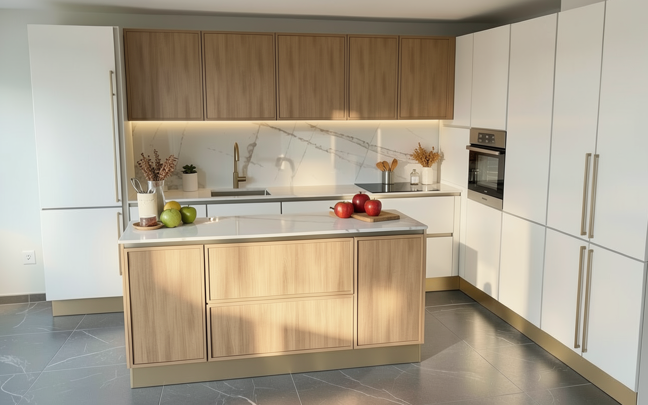 oak wood in a natural tone light matte knot free carefully selected with beautiful subtle grain no daylight artificial lighting in a warm color under the cabinet above the sink next to the wall mounted cabinet and soft ceiling lighting very gentle not harsh on the eyes a cozy bathroom in a japandi wabi sabi style