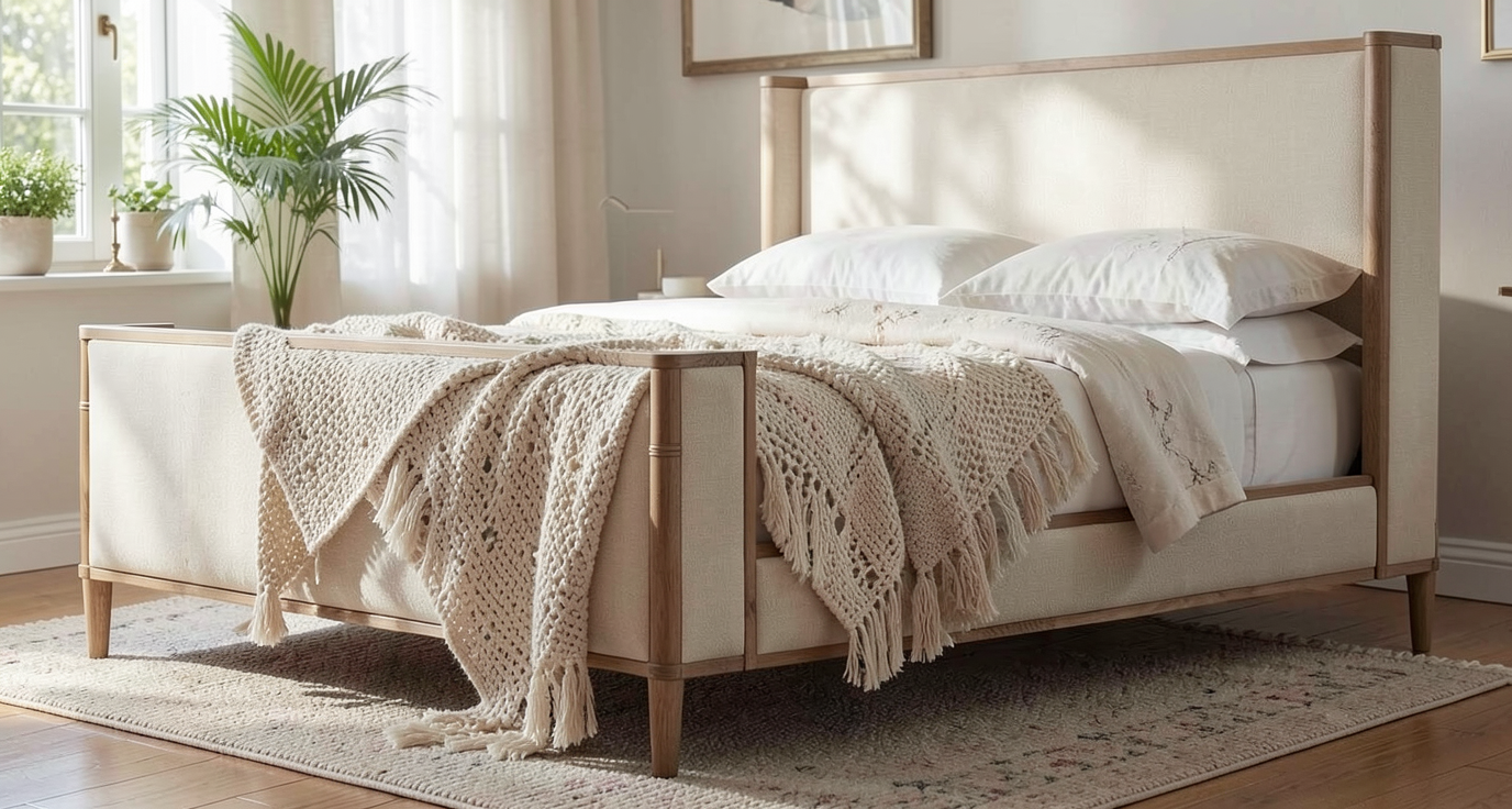 rattan weaving inspired bed white background