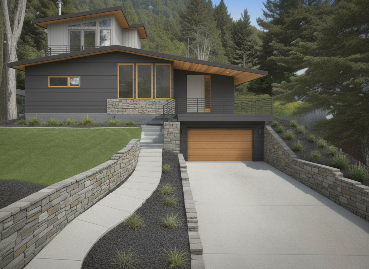 make as photorealistic as possible while keeping textures the same as selection professional landscaping in a lightly wooded scene with good lighting match materials to plan tan brick per plan light stone per plan white gutters white windows white trim weatherwood roof stained gable trim matte black porch roof stained porch columns white gable vents