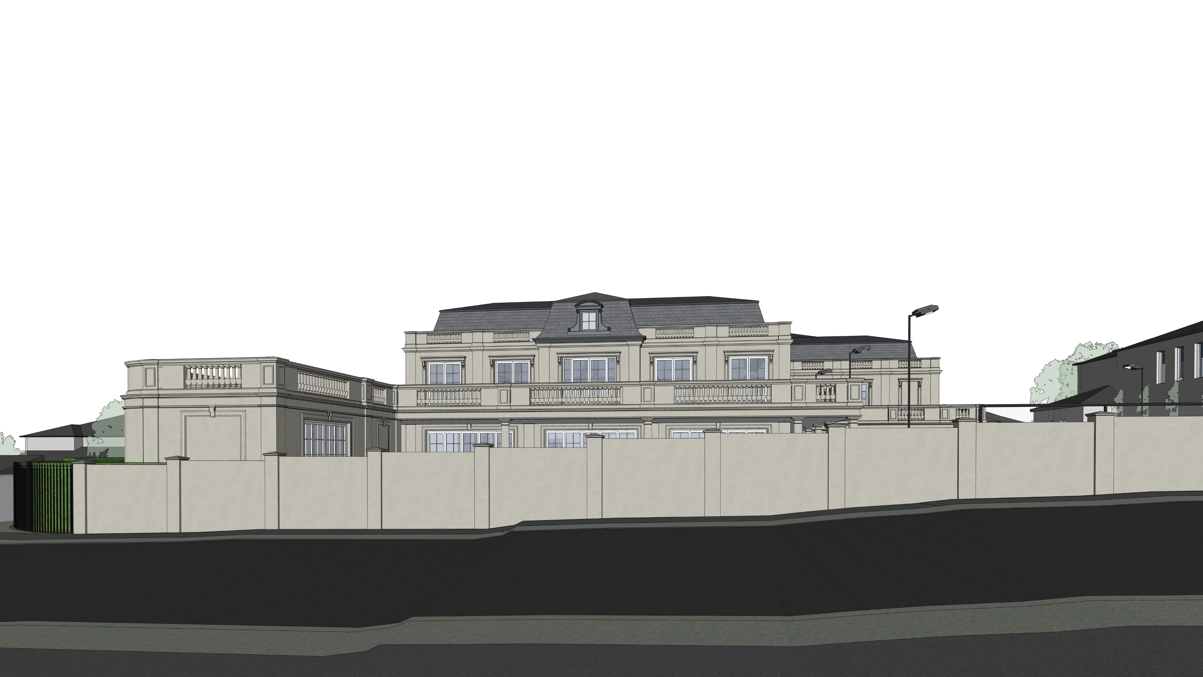 photorealistic render canon eos 5d classical home high green hedges fence dramatic lighting award winning late afternoon slate roofing wet road pedestrian gate with two vehiecular gates on the side diffused light on the curated objects within which reflect a blend of natural textures the composition should be balanced and serene evoking a sense of high end artistry with subtle reflections of the internal light the overall image should be sharp exquisite detail from the texture of the building materials to the softness of the light glow