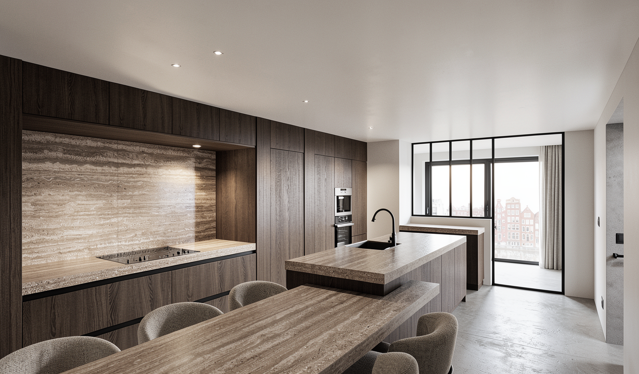 create a sketch rendering of the kitchen from a perspective angle include cabinets island panty door kitchen
