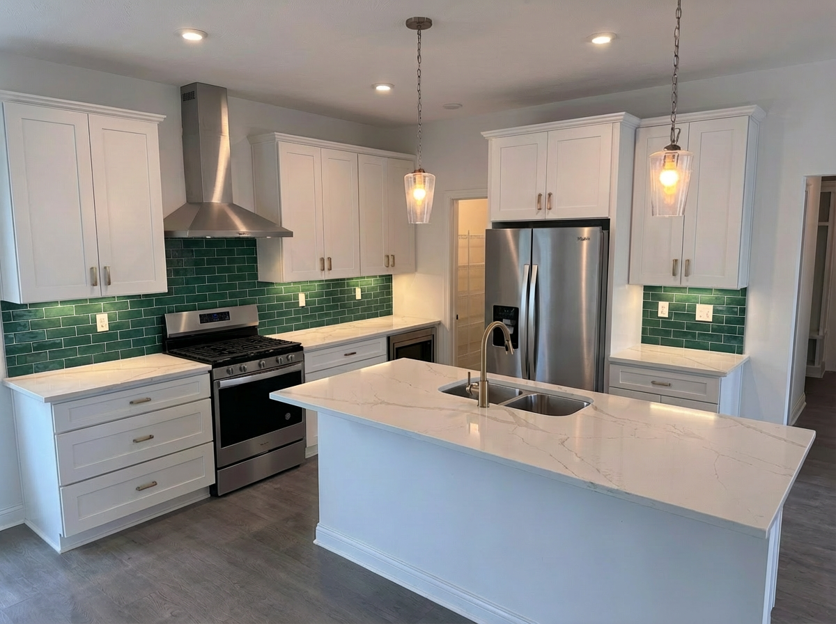 make the tile backsplash a bit darker green match daltile remedy herbal stage the photo like a model home with three woven back light wood tone barstools and a few items on the counter including a glass vase with pink peonies