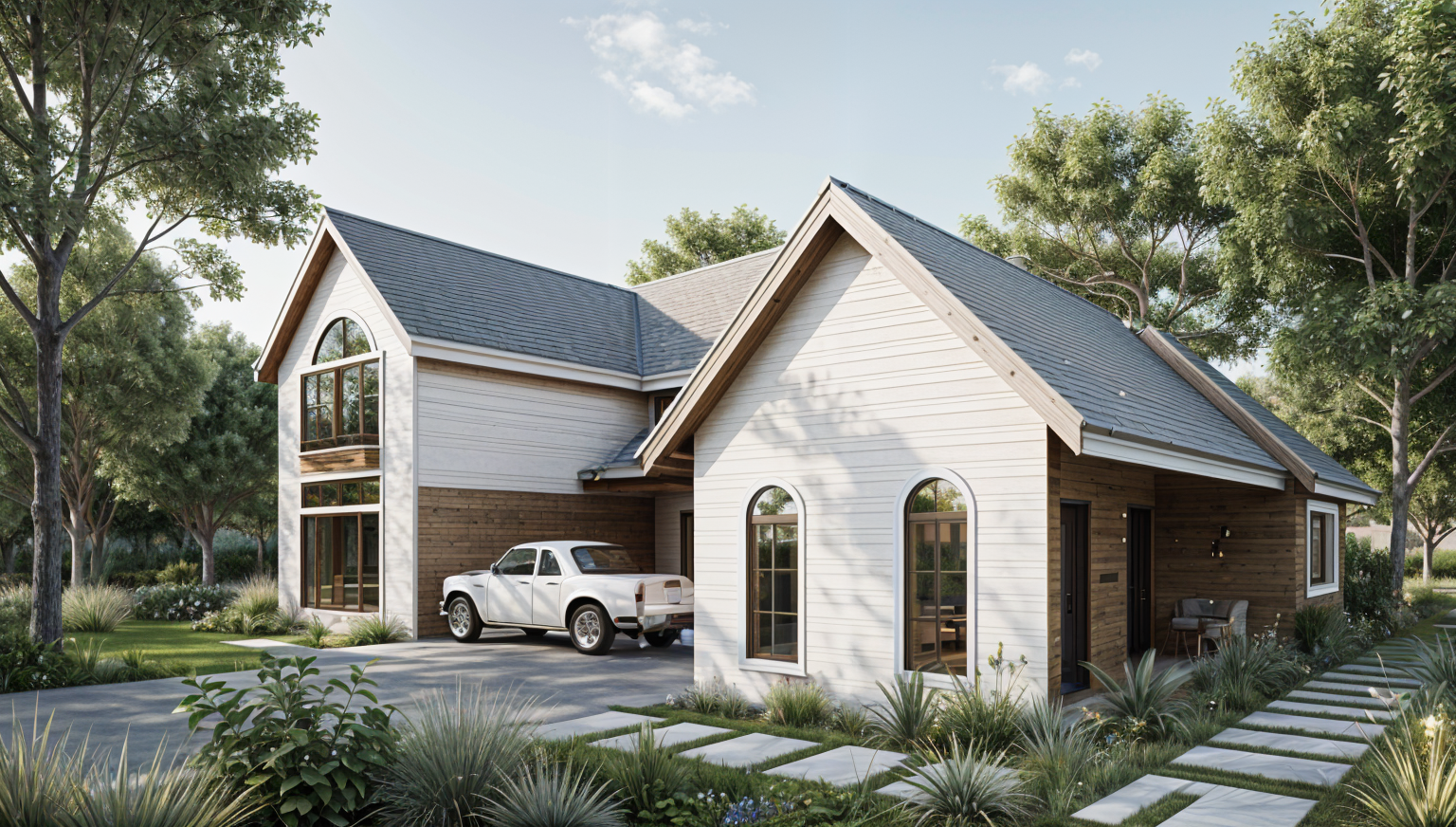 make me a modern mountain house with asphalt shingles hardie board and stone