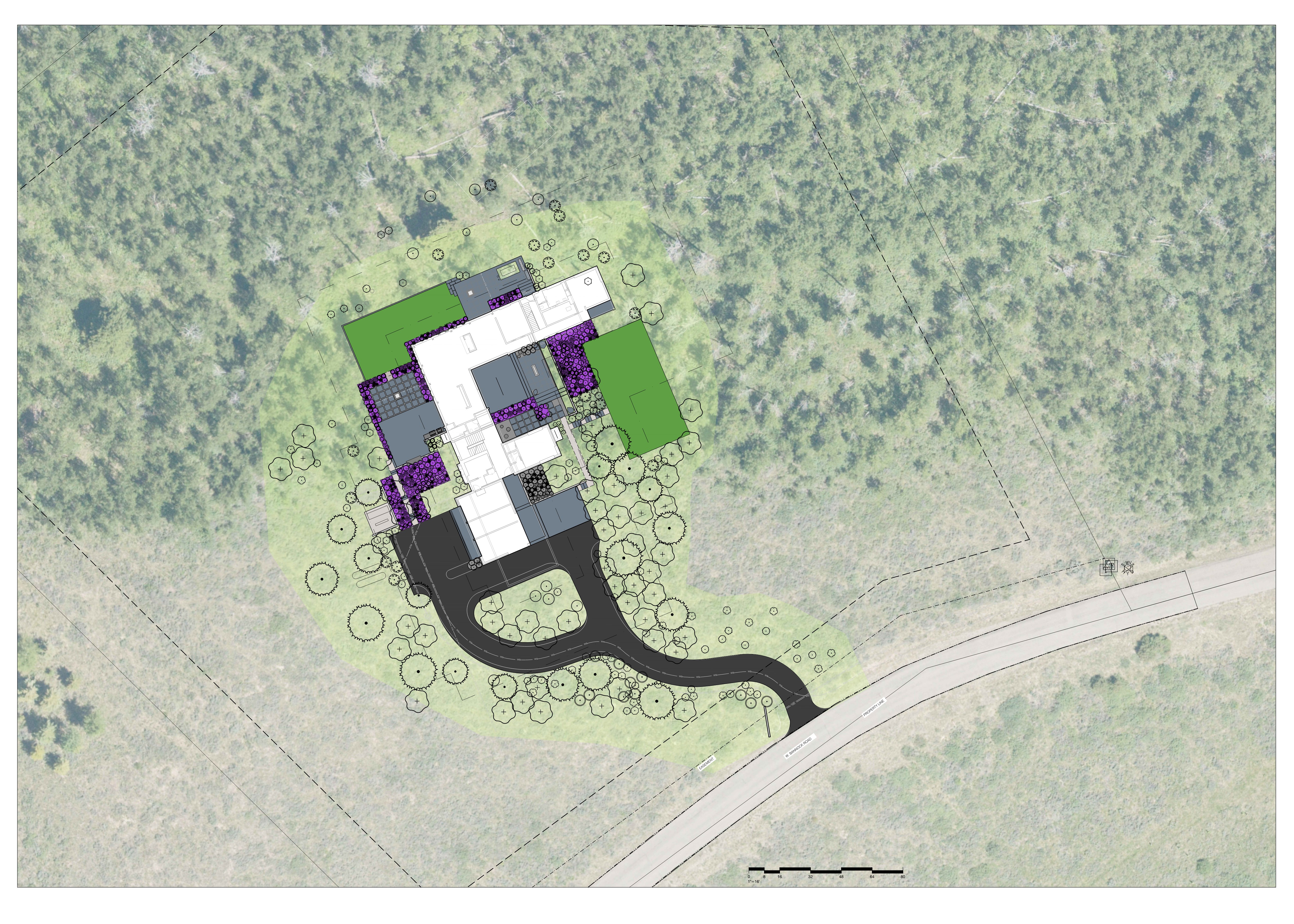 turn this site plan into a watercolor render keep the context of the aerial do not add plants not shown in the plan darker green is lawn and purple should be purple and white flowers o