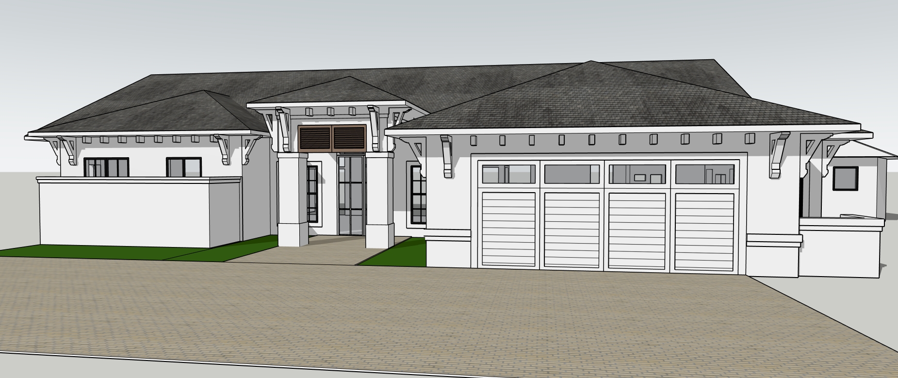 create a hyper realistic exterior photograph of a coastal house front exterior during a vibrant sunny day the house has a sleek tropical modern design with crisp white walls and white wood brackets the roof has gray cement tile large glass windows reflect the clear blue sky the garage door is white wood with some small glass openings palm trees with their lush green fronds add a tropical touch the house has surrounding green lawn the atmosphere is tranquil and luxurious with sunlight casting gentle shadows evoking a sense of relaxation and opulence
