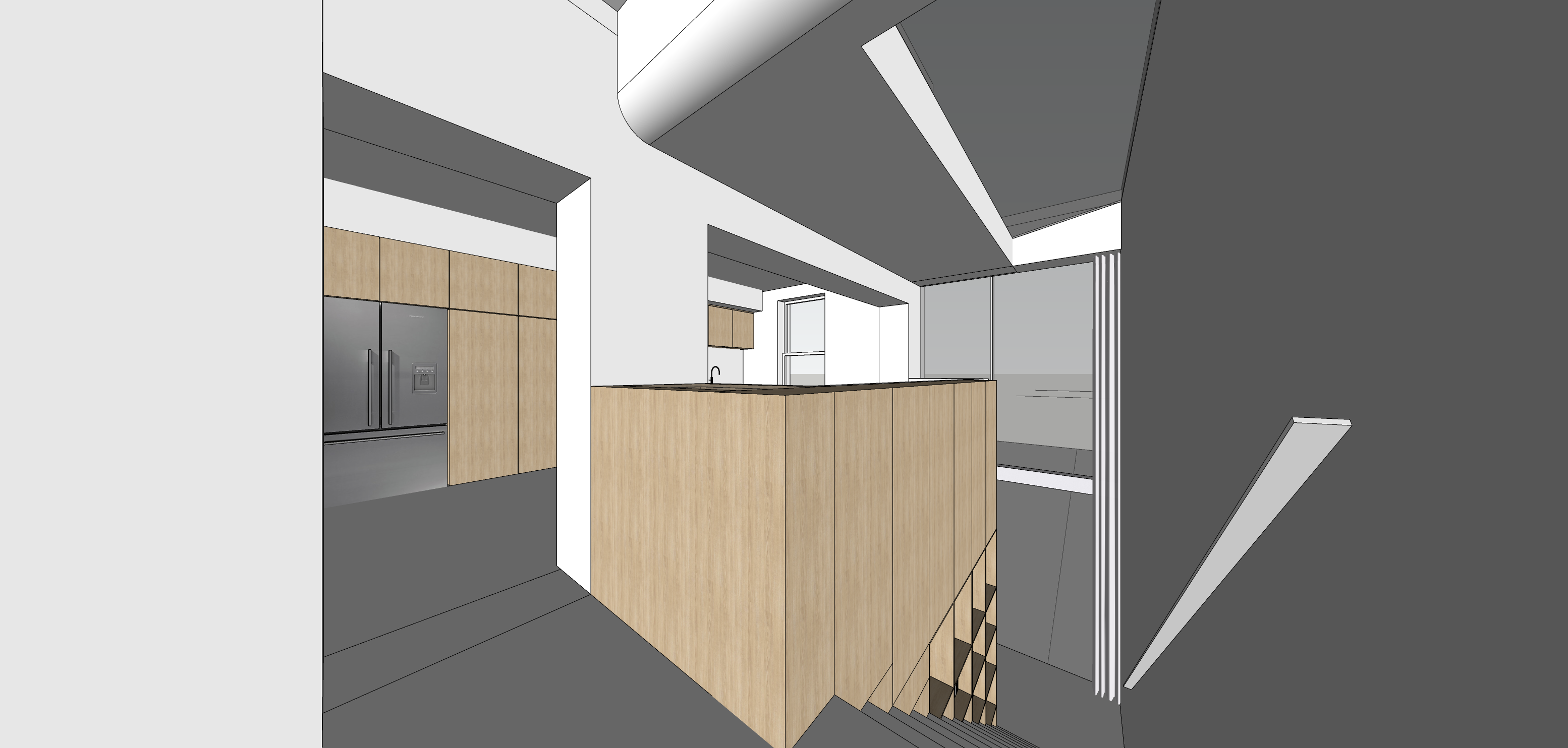 create a serene atmospheric perspective image with soft diffused lighting and minimal reflection the whole image is very light with lots of natural daylight inside the spaces there are feature items of joinery with matt pale oak panels and kitchen with white metal balustrading to the stairs a rooflight along the back of the building brings lots of natural daylight into the spaces the quality of the image is ethereal almost appears like an illustration with soft lighting and slight haze