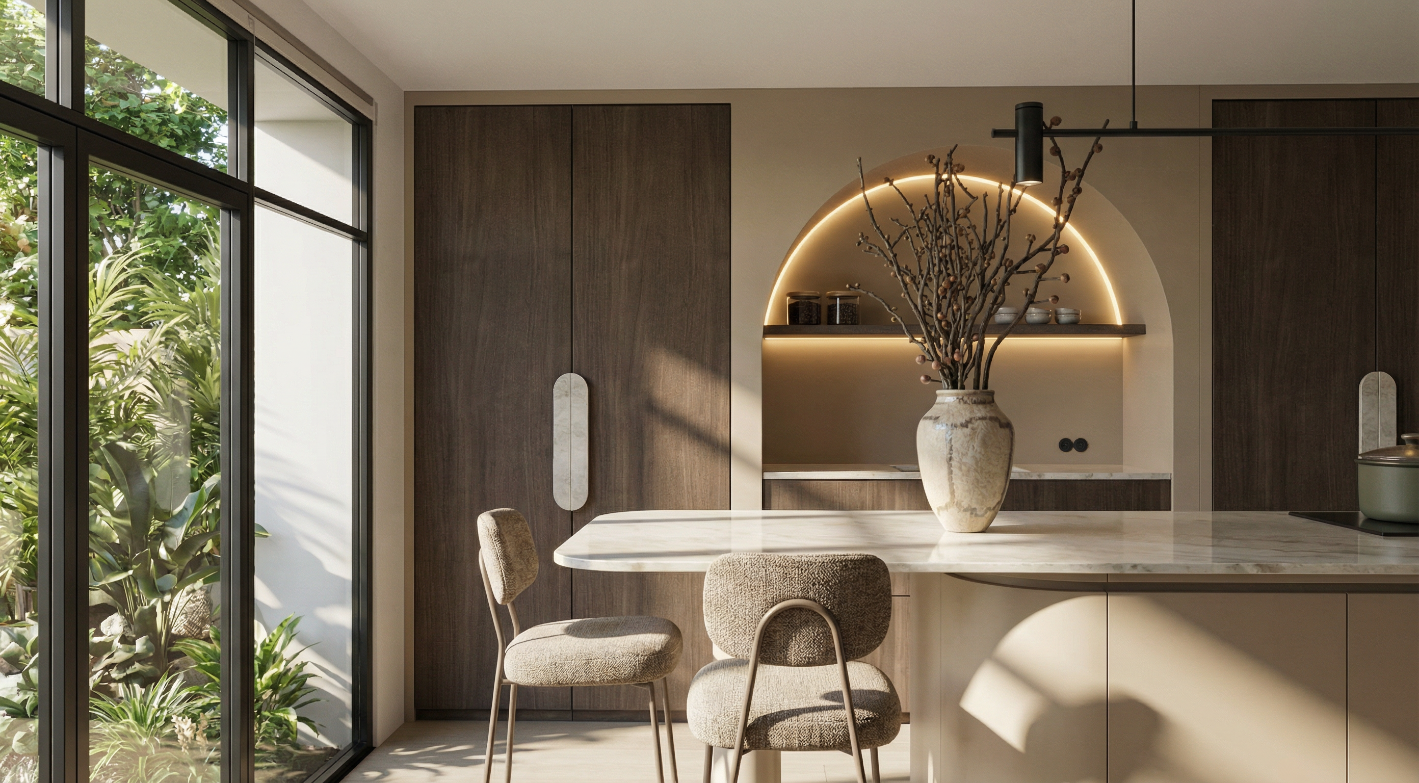 make the kitchen countertop in taj mahal stone matching the oval handles on the tall cabinets and paint the bottom part in beige miral paint install an led strip under the shelves make outisde a house arden mae the vase color fun an the barstool more terracotta