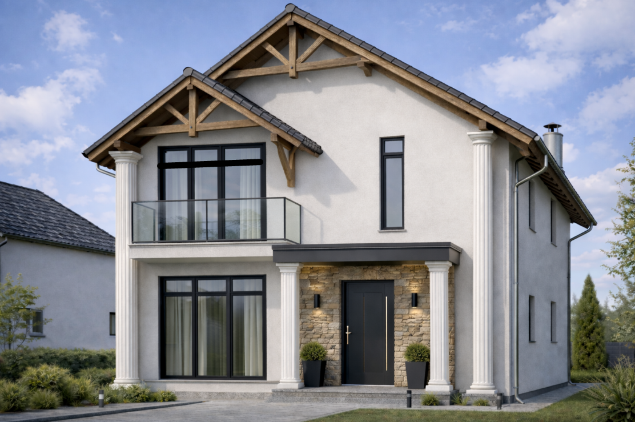 replace all exterior columns located at the building corners with flat decorative wall trims pilasters requirements the elements must be flat and directly applied on the facade flush with the wall no volumetric columns no round or protruding shapes minimal depth max 3 5 cm visual thickness clean rectangular geometry sharp edges same color and material as the facade white stucco include simple top and bottom caps subtle not classical heavy ornaments keep proportions similar to reference image modern minimal corner trims important do not generate columns do not create structural elements do not extend them away from the wall they must look like decorative profiles attached to the facade style modern european house minimalist detailing clean lines