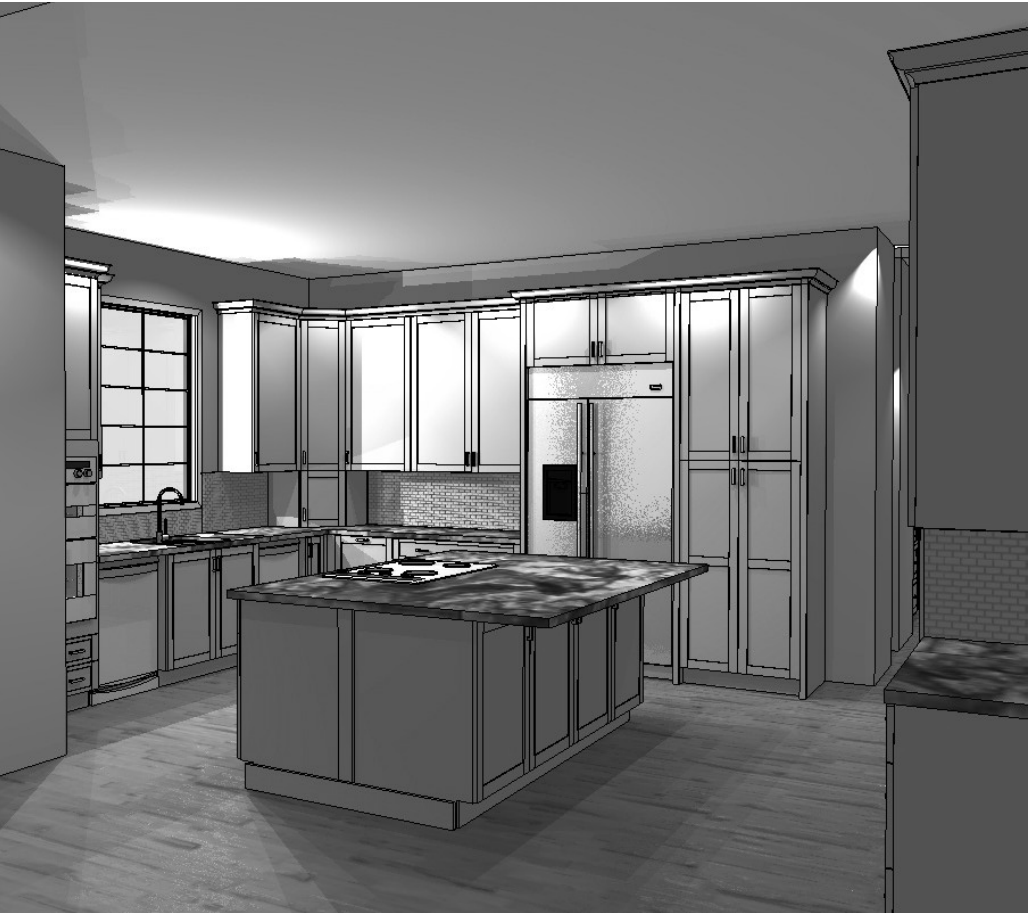 render a modern kitchen with a sleek sophisticated atmosphere use a color palette of soft whites and grays for the cabinets and walls to create a clean and airy feel apply a polished marble texture for the countertops in a subtle blend of dark gray and white veining the floor should have a rich wood texture in a warm medium brown tone adding warmth and contrast include stainless steel appliances for a contemporary touch illuminate with gentle warm lighting to enhance the inviting atmosphere