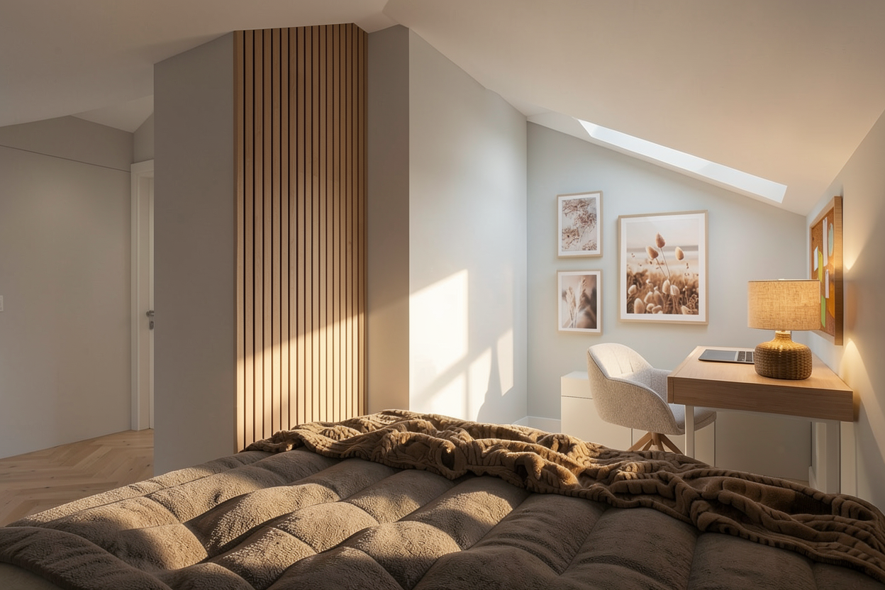 transform this visualization into a luxurious evening scene with intense atmosphere and cinematic lighting preserve all materials colors and architecture exactly layer ambient accent and decorative lighting to create depth dramatic shadows and glowing highlights across walnut wood champagne velvet and mineral surfaces add subtle decorative light sources sconces floor uplights integrated accent lighting where appropriate to increase drama elegance and sophistication focus on interplay of light shadow reflections and atmospheric layering to make the space feel immersive refined and memorable do not change materials or furniture