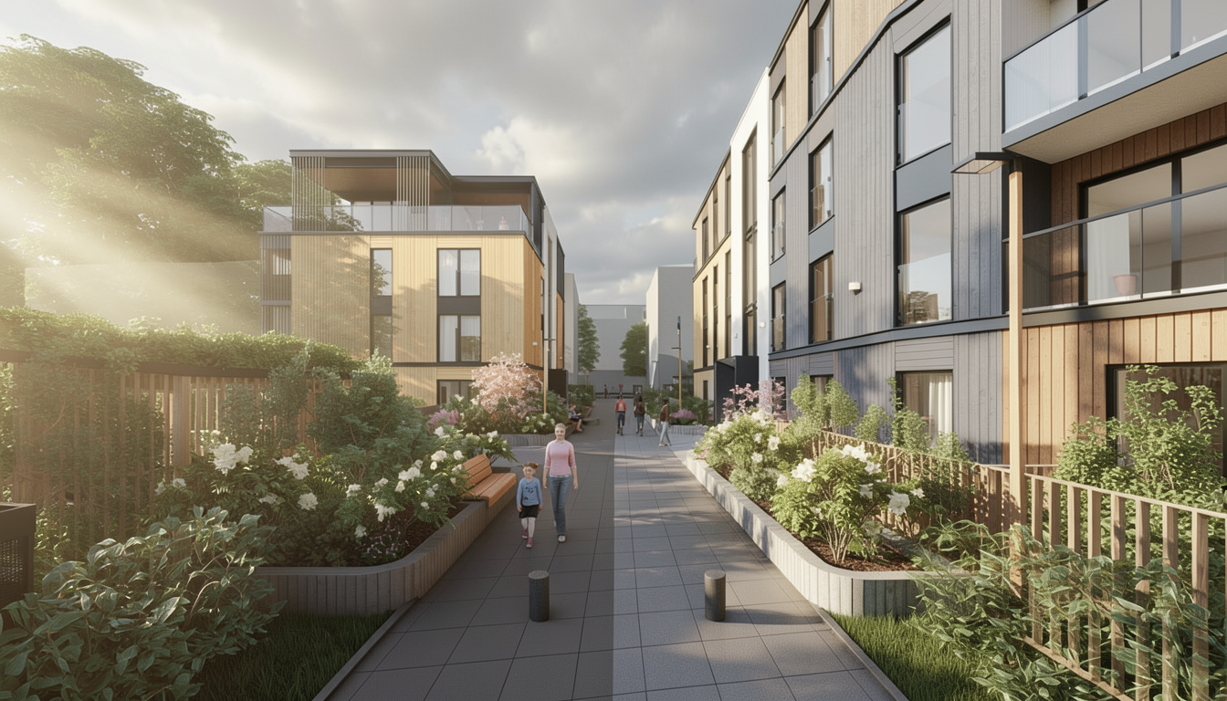 photorealistic architectural photograph captured at 2 pm on a cloudy day sunlight beams from the left side soft lighting keep the massing and facade materials layout keep the original facade material placement and color palette keep the saturation of the orange and yellow colors the vegetation is nordic garden style keep the amount and massing of the vegetation