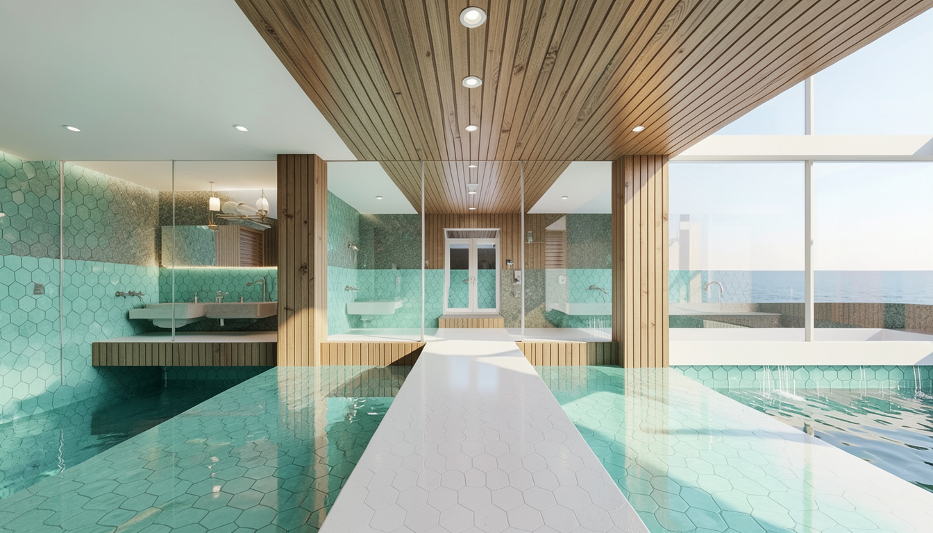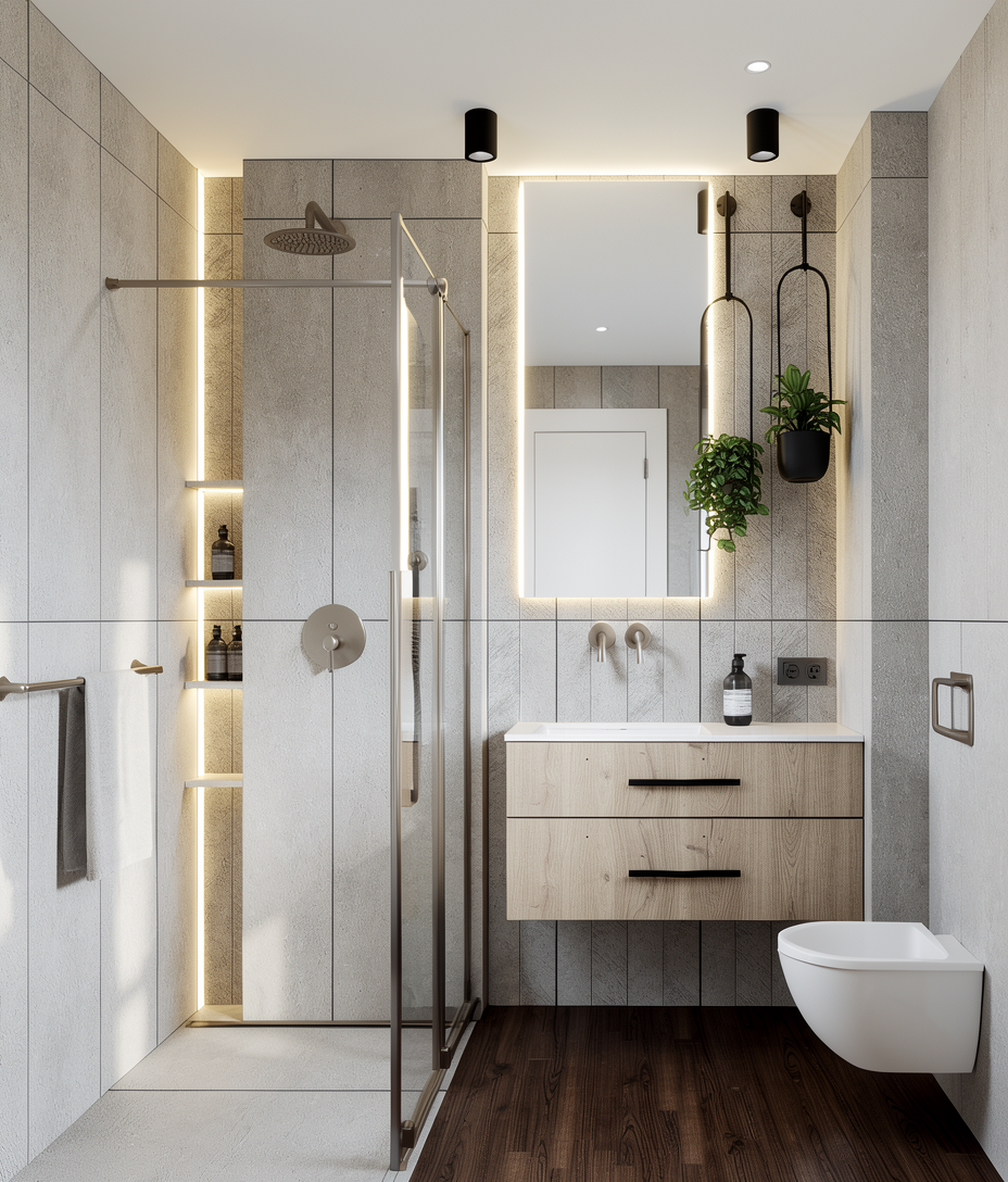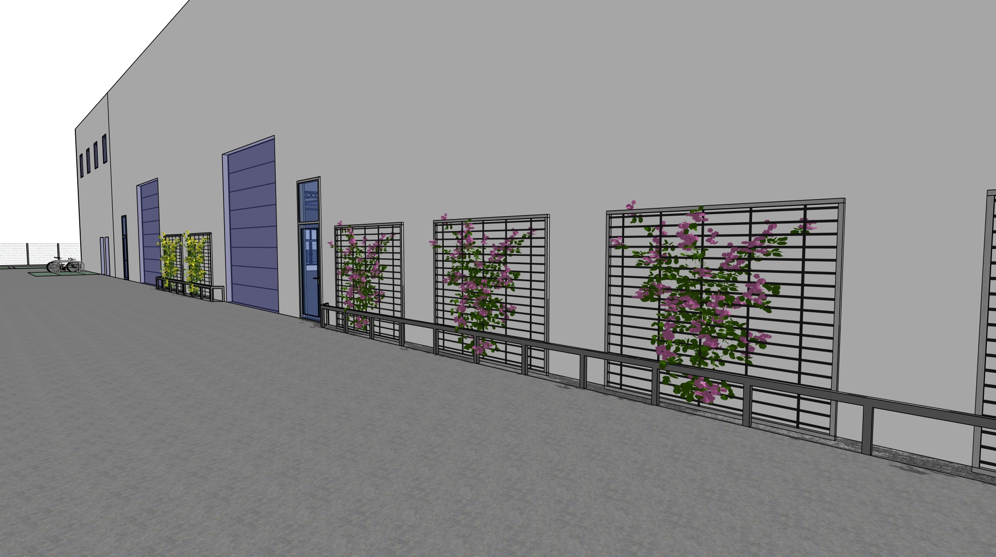 eye level exterior architectural photography of a modern commercial warehouse facade on a moody overcast day just after a rain shower soft diffused natural lighting clean white exterior walls matte blue industrial roller doors and a reflective glass pedestrian door detailed metal trellises with vibrant realistic climbing vines featuring pink and yellow flowers the rich green leaves are slightly wet and glistening wet dark asphalt walkway in the foreground with subtle puddles reflecting the soft sky and the building s facade cinematic atmosphere corona render style hyper realistic highly detailed 8k resolution