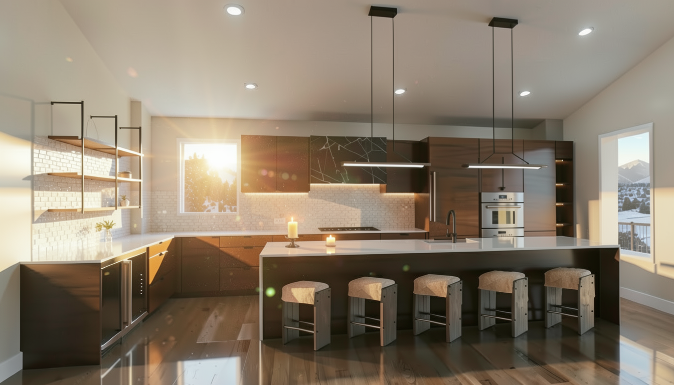refine this image to look photo realistic match the back of the island behind the stools to match the cabinetry fix the wine bottle on the counter to look more realistic