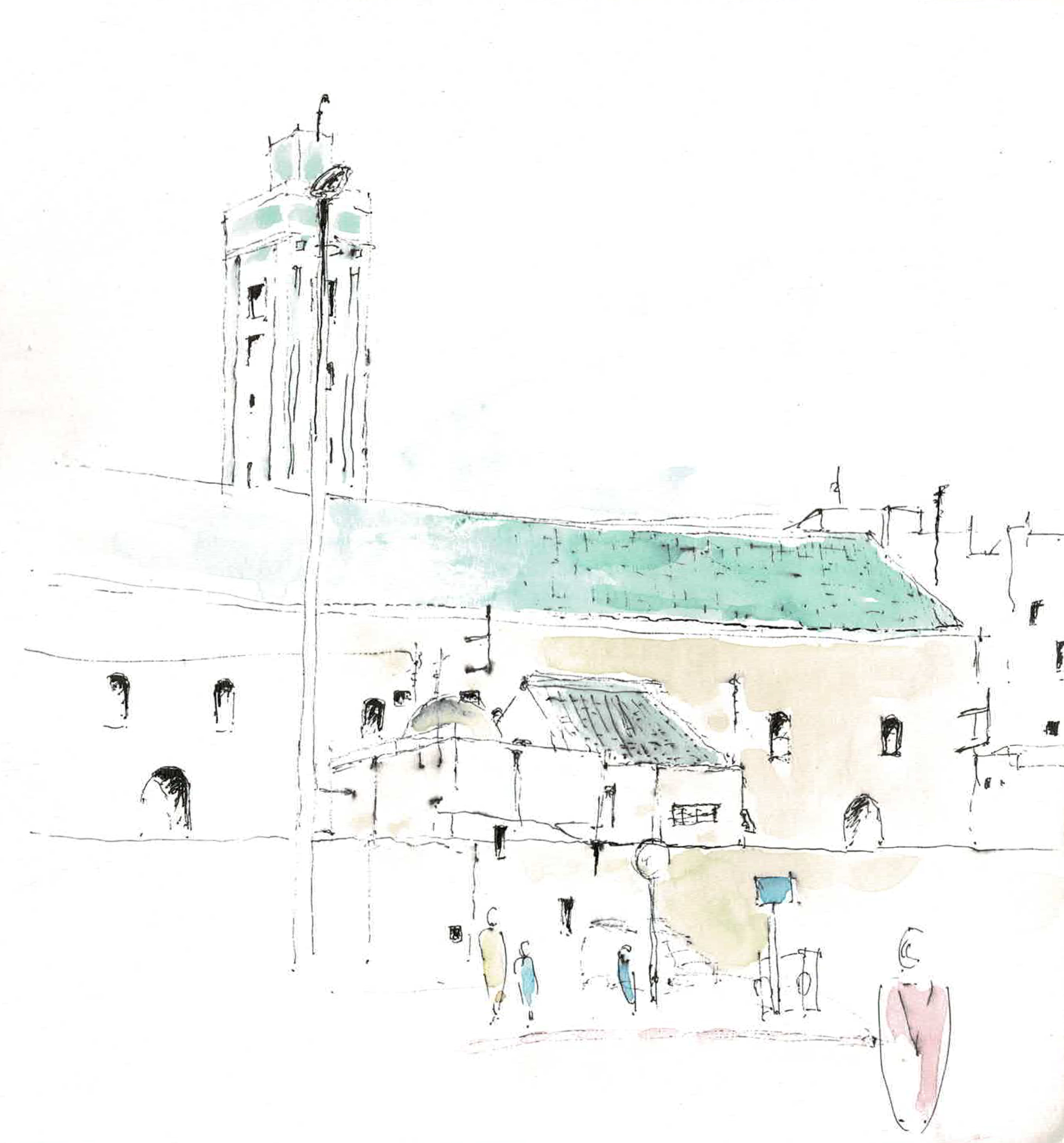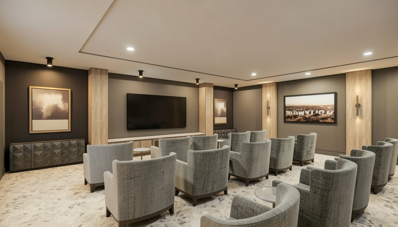 render a modern architectural scene in a sunny serene atmosphere the main building features clean angular lines with a combination of concrete and glass in neutral tones such as light gray and white surround the structure with lush green trees and add patches of blue sky include a subtle warm glow from the sunlight reflecting off the glass surfaces show a paved walking area in soft beige stone and incorporate a few small human figures for scale dressed in casual light colored attire emphasize a peaceful and minimalist aesthetic