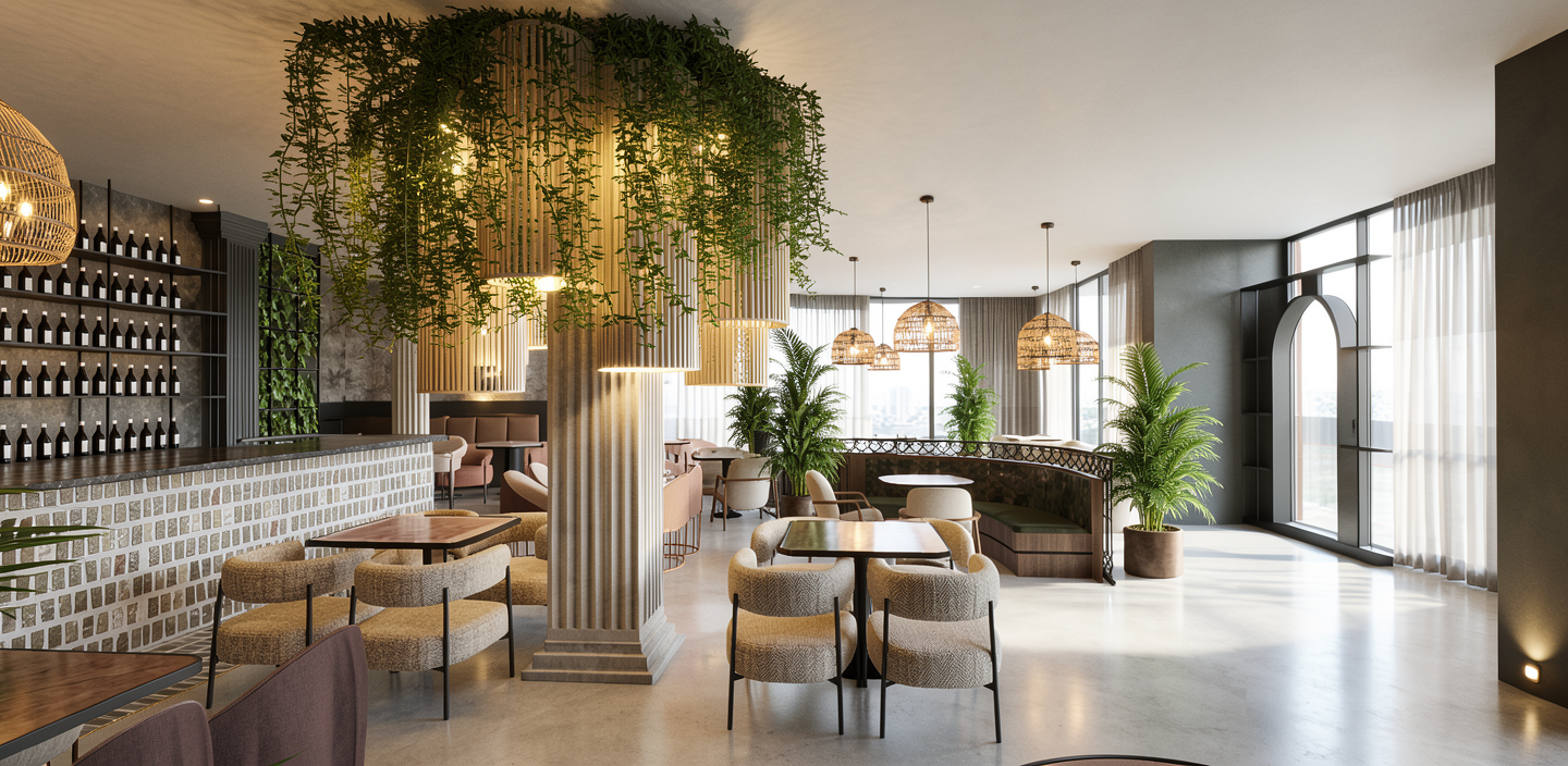 make a high quality render photo don t change anything the ambient light should be natural the textures should look real and high quality so don t change anything in the design or order just make the render look high quality and real and the lighting of the lights look real the restaurant should be luxurious