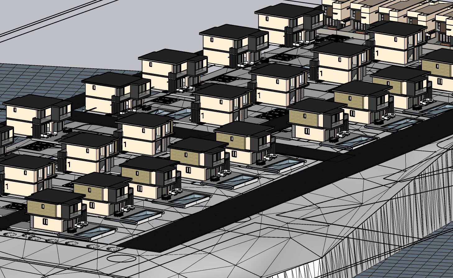ultra photorealistic aerial architectural render of a modern villa masterplan strictly based on the provided input image critical preserve exactly exact number of villas exact positions spacing and orientations exact road layout and circulation exact site boundaries and geometry no additions no deletions no reinterpretation this is an image to image transformation the base plan must remain 100 identical architecture contemporary minimalist villas flat roofs clean volumes warm beige plaster natural travertine stone cladding matte black dark aluminum window frames large glass openings with subtle reflections realistic scale and proportions landscape mediterranean vegetation olive trees cypress low shrubs dry grass natural distribution avoid repetition layered planting foreground midground background depth terrain clearly visible sloped topography not flat approx 10m level difference across site villas stepping naturally with terrain soft terrain deformation erosion and color variation roads surfaces realistic asphalt roads with slight wear light stone pavements subtle curb details driveways clearly defined pools each villa has a private pool realistic water reflections slight ripples lighting very important golden hour sunset strong directional light long soft shadows warm highlights cool shadows cinematic contrast render style ultra realistic real estate marketing quality pbr materials physically correct textures global illumination ambient occlusion slight atmospheric haze for depth sharp but natural not overprocessed camera aerial 3 4 perspective slightly angled not top down wide lens but no distortion quality 8k resolution highly detailed cinematic composition