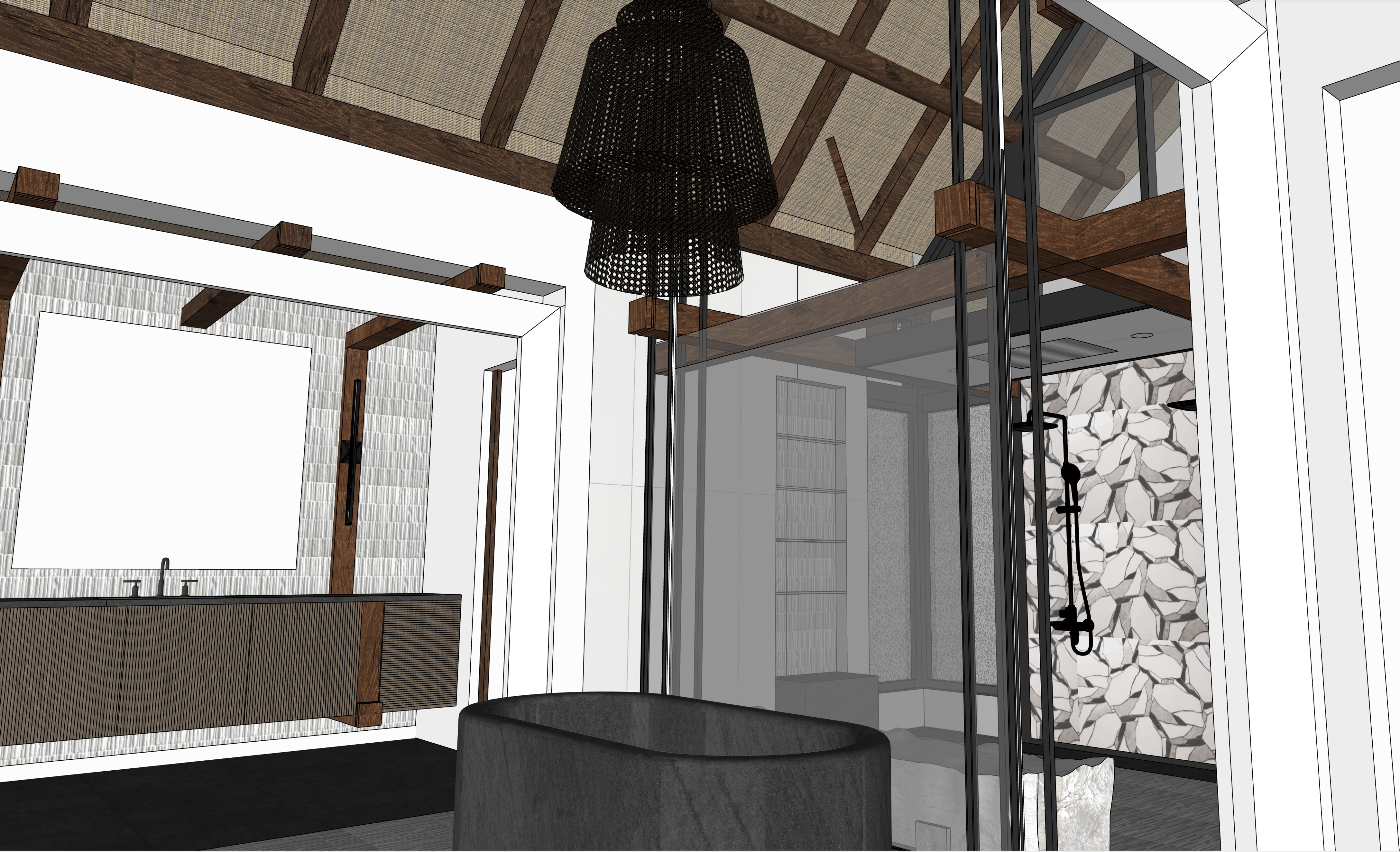 bali inspired bathroom grasscloth ceiling panels make white square above sink at left of image into a window with a circular mirror floating in front of it basalt stone tub