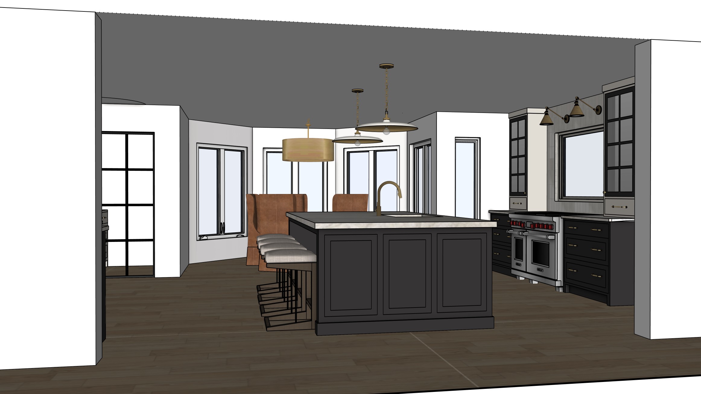 ultra realistic kitchen rendering based on a sketchup model realistic cabinetry materials soft beige painted hutches with black doors quartzite countertops with subtle veining accurate texture scale white oak floors with subtle wear and color variation matte painted walls with slight texture realistic fabric upholstery with visible weave physically accurate reflections and shadows soft indirect light global illumination professional interior photography crisp edges high detail clean modern aesthetic full frame camera 28mm lens