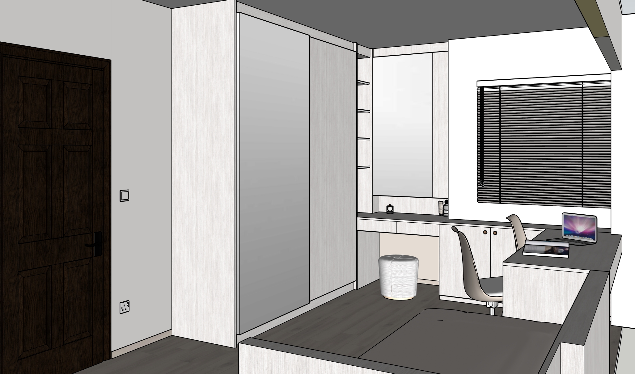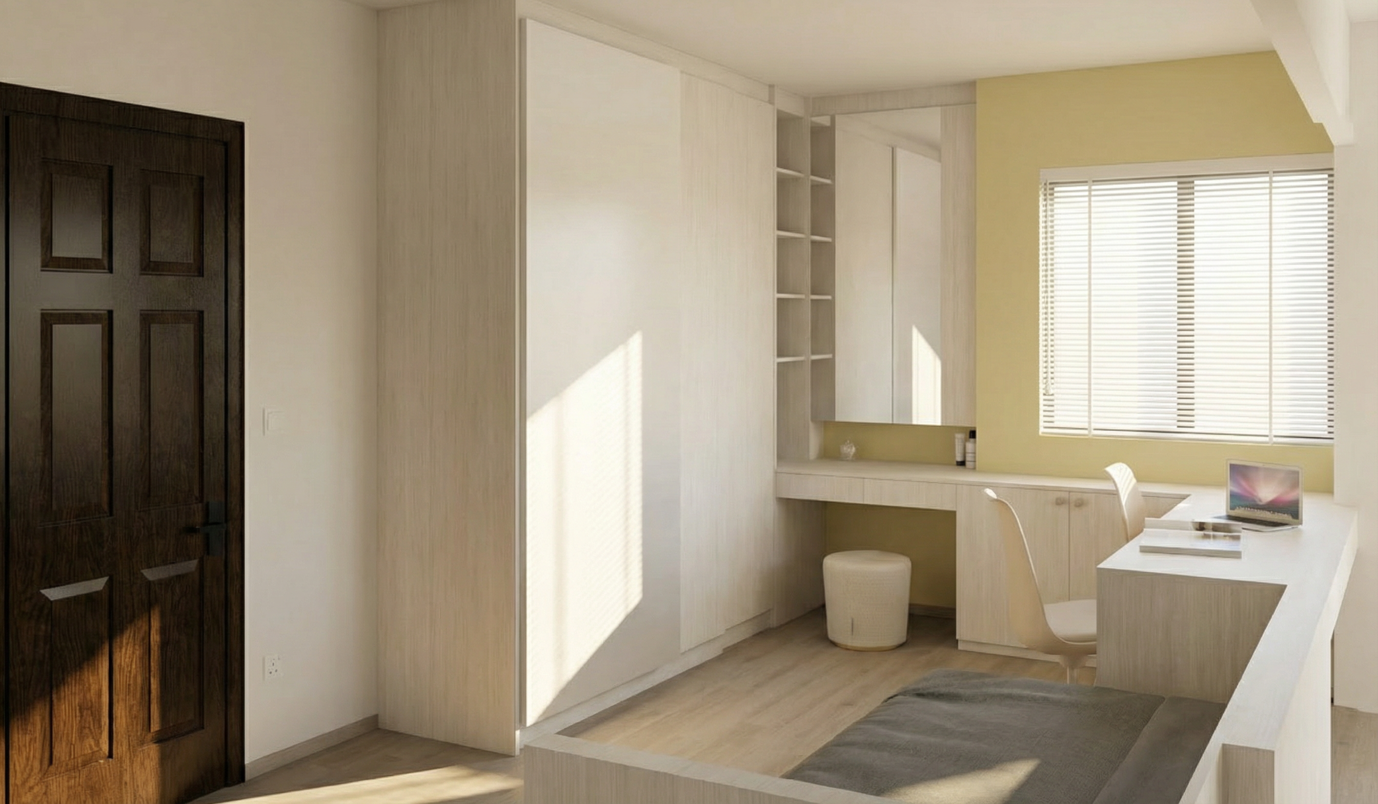 colours and texture to remain accurate as per given picture floor in light beige brown vinyl wood texture subtle carpentry in cream white with subtle wood grains counter surface in cream white with subtle wood grains left sliding door in mirror blinds in white seat cushion in off white