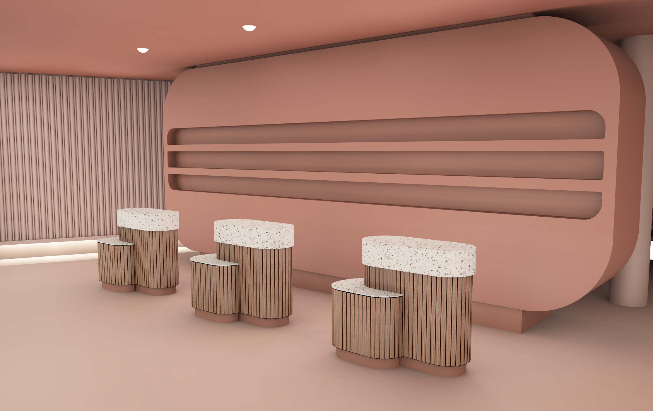 sockel der terminals und die gro e abgerundete wand haben die gleiche farbe rostrot terakotta wandprofile links durchgehend spot lights von oben ber terminals halte proportionen und details wie im original winkel ebenso